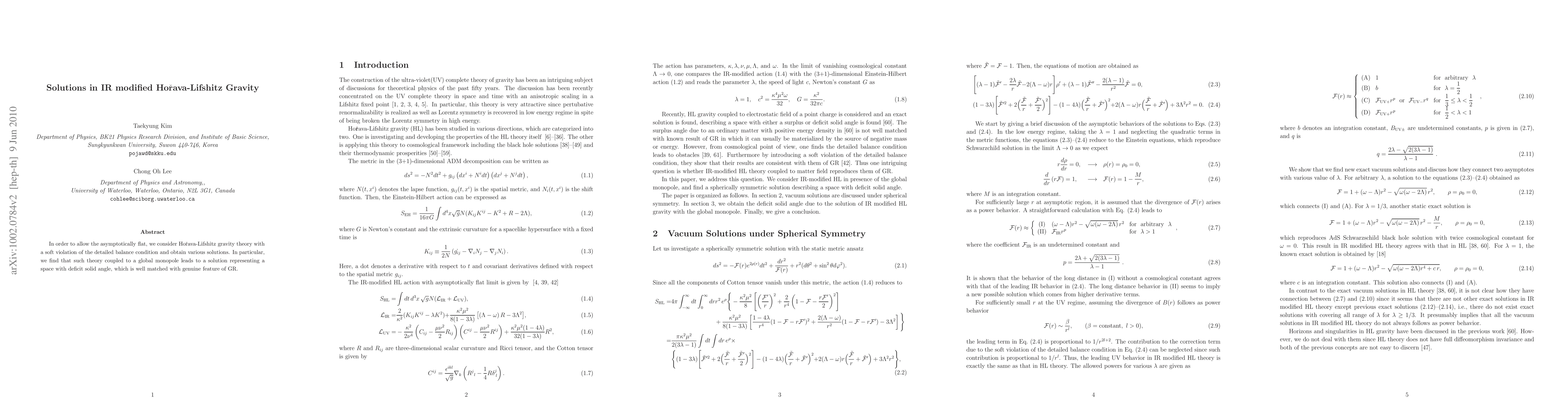 This research paper explores solutions in modified Horava-Lifshitz gravity theory, finding a deficit solid angle solution that matches general relativity's features when coupled with a global monopole.