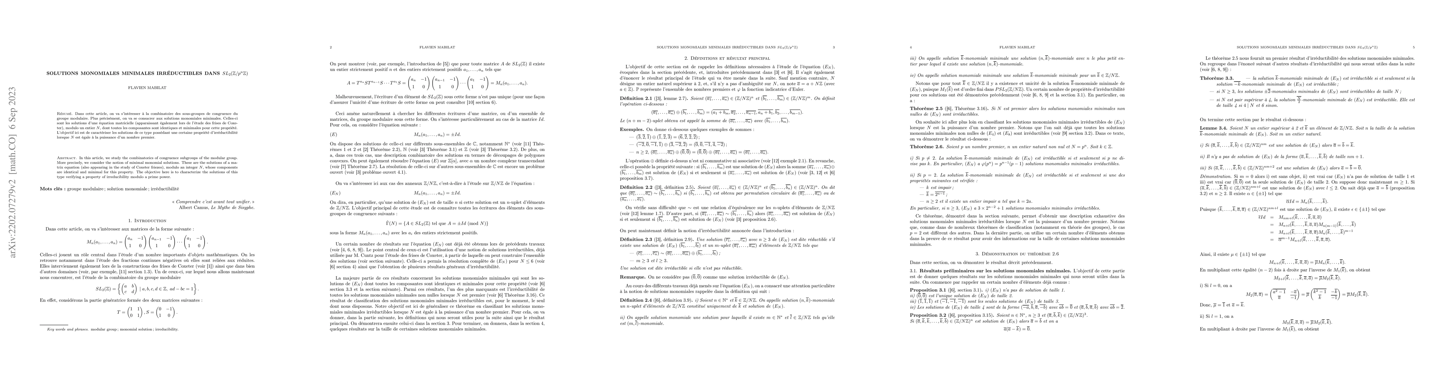 In this article, we study the combinatorics of congruence subgroups of the modular group. More precisely, we consider the notion of minimal monomial solutions. These are the solutions of a matrix equation (also appearing in the study of Coxeter friezes), modulo an integer $N$, whose components are identical and minimal for this property. The objective here is to characterize the solutions of this type verifying a property of irreducibility modulo a prime power.