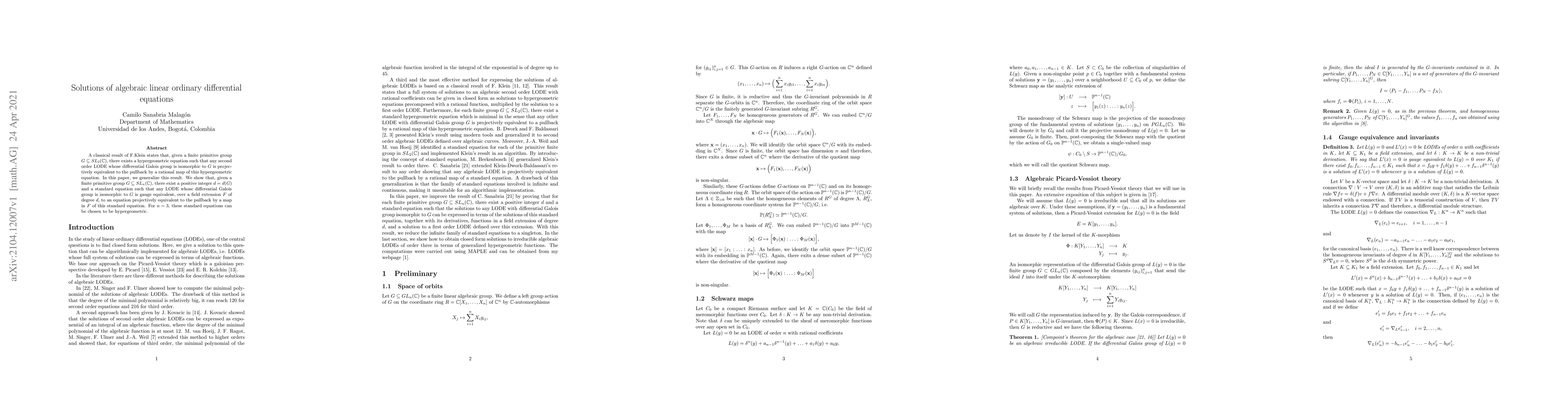 A classical result of F.Klein states that, given a finite primitive group $G\subseteq SL_2(\mathbb{C})$, there exists a hypergeometric equation such that any second order LODE whose differential Galois group is isomorphic to $G$ is projectively equivalent to the pullback by a rational map of this hypergeometric equation. In this paper, we generalize this result. We show that, given a finite primitive group $G\subseteq SL_n(\mathbb{C})$, there exist a positive integer $d=d(G)$ and a standard equation such that any LODE whose differential Galois group is isomorphic to $G$ is gauge equivalent, over a field extension $F$ of degree $d$, to an equation projectively equivalent to the pullback by a map in $F$ of this standard equation. For $n=3$, these standard equations can be chosen to be hypergeometric.