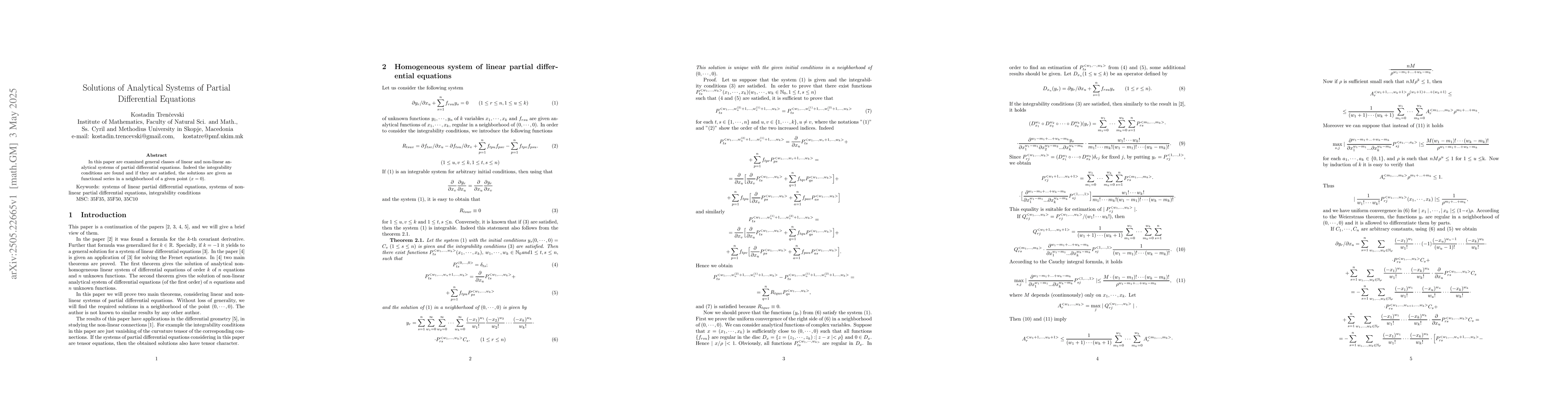 The paper investigates general classes of linear and non-linear analytical systems of partial differential equations, deriving integrability conditions and providing solutions as functional series near a specified point (x=0).