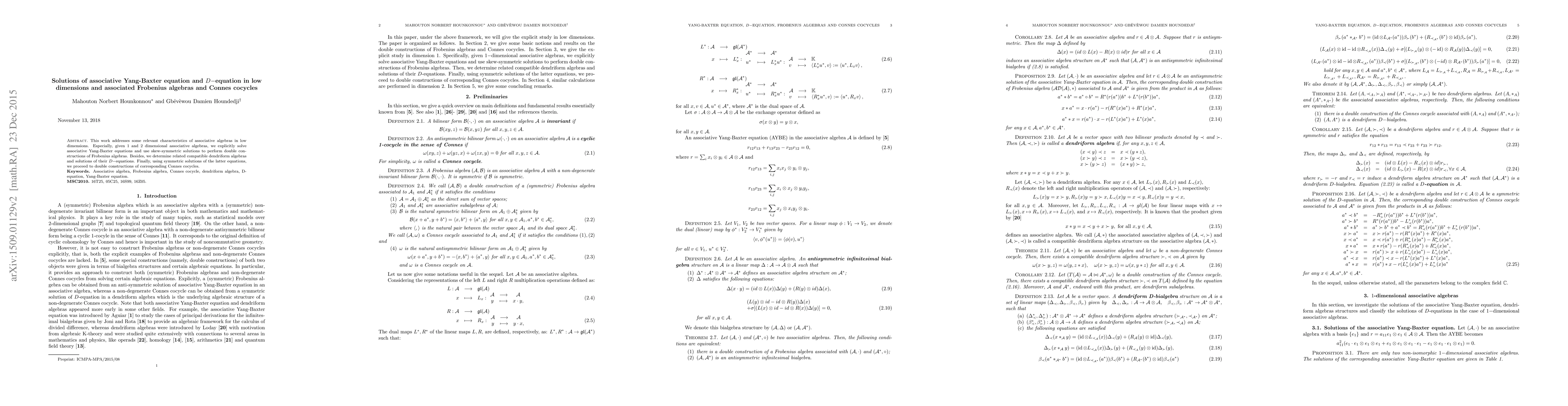 The paper presents detailed classifications and constructions of Frobenius algebras, dendriform structures, and Connes cocycles associated with solutions of AYBE and D-equations in low dimensions.
