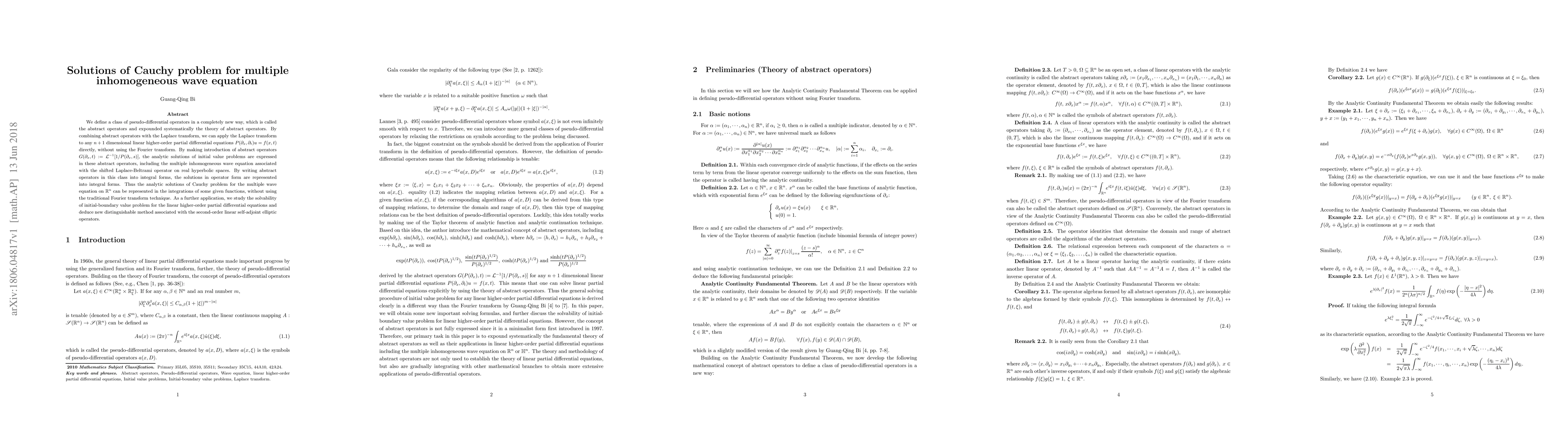 We define a class of pseudo-differential operators in a completely new way, which is called the abstract operators and expounded systematically the theory of abstract operators. By combining abstract operators with the Laplace transform, we can apply the Laplace transform to any $n+1$ dimensional linear higher-order partial differential equations $P(\partial_x,\partial_t)u=f(x,t)$ directly, without using the Fourier transform. By making introduction of abstract operators $G(\partial_x,t):=\mathcal{L}^{-1}[1/P(\partial_x,s)]$, the analytic solutions of initial value problems are expressed in these abstract operators, including the multiple inhomogeneous wave equation associated with the shifted Laplace-Beltrami operator on real hyperbolic spaces. By writing abstract operators in this class into integral forms, the solutions in operator form are represented into integral forms. Thus the analytic solutions of Cauchy problem for the multiple wave equation on $\mathbb{R}^n$ can be represented in the integrations of some given functions, without using the traditional Fourier transform technique. As a further application, we study the solvability of initial-boundary value problem for the linear higher-order partial differential equations and deduce new distinguishable method associated with the second-order linear self-adjoint elliptic operators.