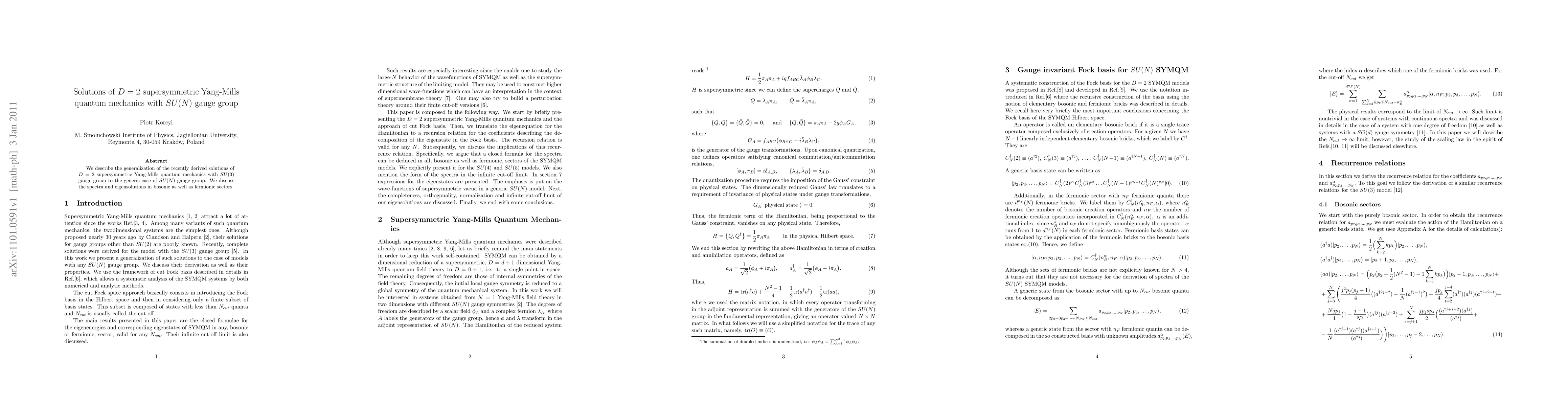 Summary: This paper generalizes previously found solutions for D=2 supersymmetric Yang-Mills quantum mechanics with SU(3) gauge group to the broader SU(N) case, detailing spectra and eigensolutions for both bosonic and fermionic sectors.