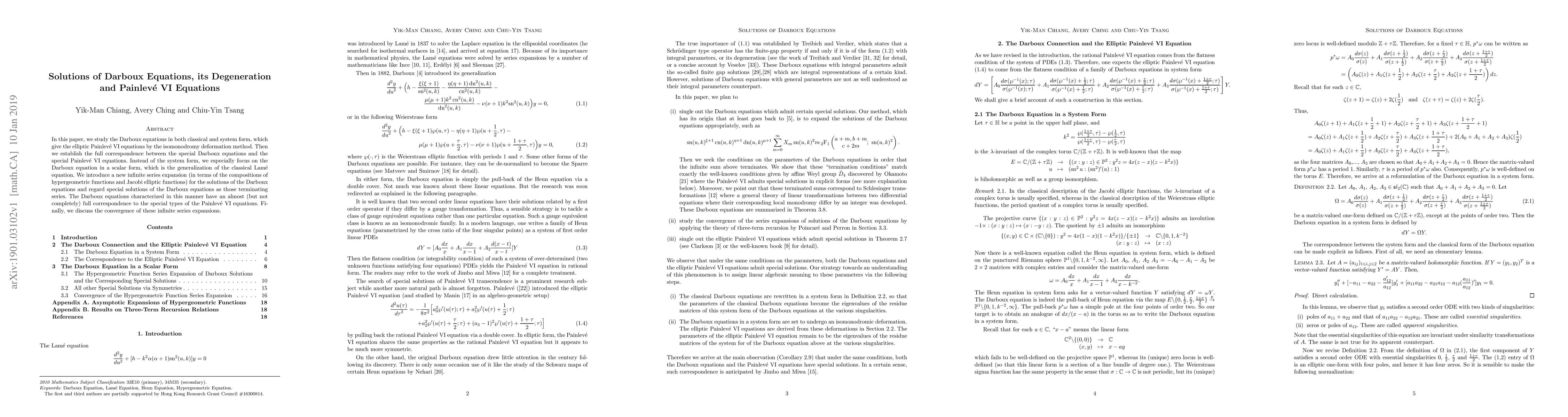 This paper investigates Darboux equations, particularly in scalar form, and their relation to the Painlevé VI equations. It establishes a correspondence between these equations and introduces new infinite series expansions for Darboux solutions, focusing on their convergence and special terminating series linked to Painlevé VI equations.