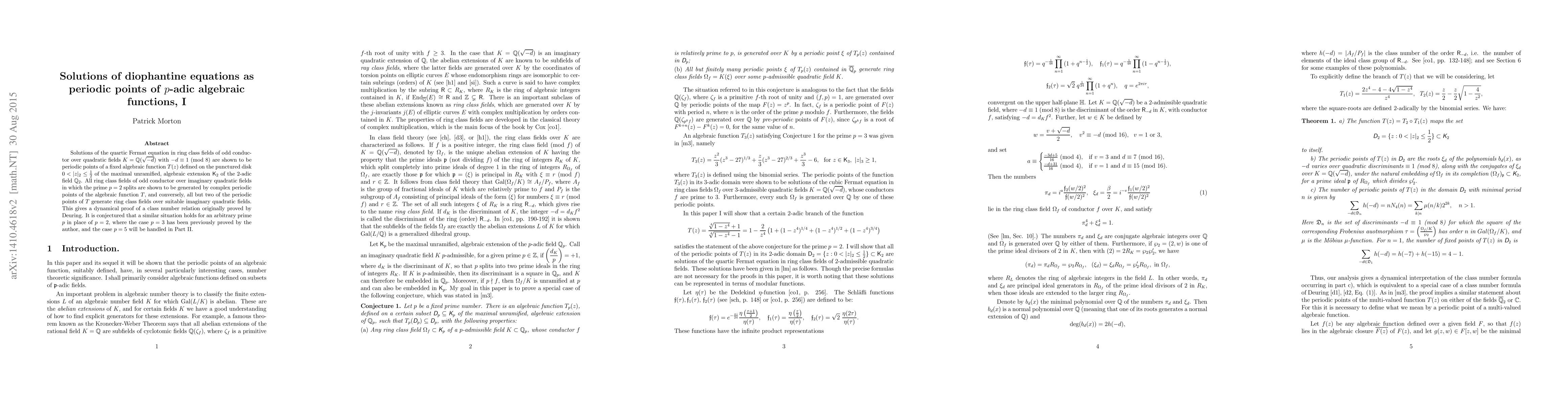 Solutions of the quartic Fermat equation in ring class fields of odd conductor over quadratic fields $K=\mathbb{Q}(\sqrt{-d})$ with $-d \equiv 1$ (mod $8$) are shown to be periodic points of a fixed algebraic function $T(z)$ defined on the punctured disk $0< |z|_2 \le \frac{1}{2}$ of the maximal unramified, algebraic extension $\textsf{K}_2$ of the $2$-adic field $\mathbb{Q}_2$. All ring class fields of odd conductor over imaginary quadratic fields in which the prime $p=2$ splits are shown to be generated by complex periodic points of the algebraic function $T$, and conversely, all but two of the periodic points of $T$ generate ring class fields over suitable imaginary quadratic fields. This gives a dynamical proof of a class number relation originally proved by Deuring. It is conjectured that a similar situation holds for an arbitrary prime $p$ in place of $p=2$, where the case $p=3$ has been previously proved by the author, and the case $p=5$ will be handled in Part II.