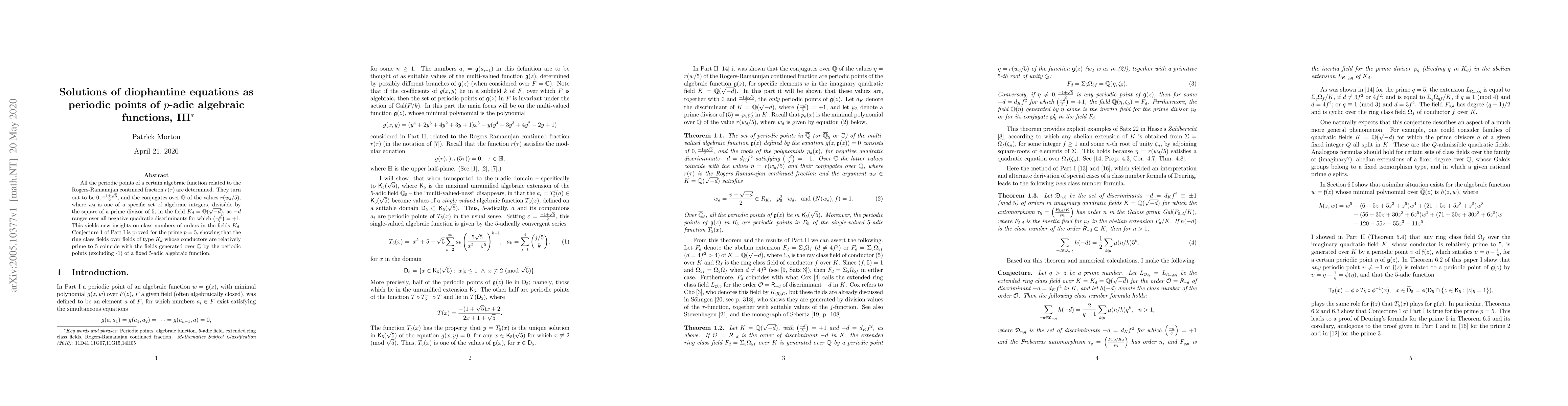 This paper determines the periodic points of an algebraic function tied to the Rogers-Ramanujan continued fraction, revealing them as specific values and their conjugates. It provides new insights into class numbers of orders in certain quadratic fields and proves Conjecture 1 for the prime $p=5$.