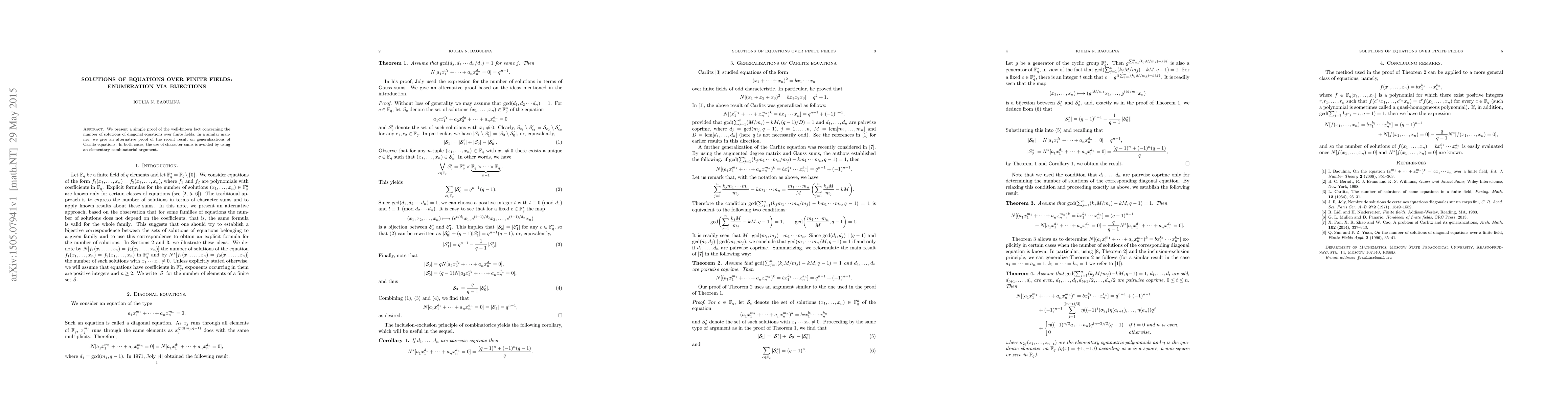 We present a simple proof of the well-known fact concerning the number of solutions of diagonal equations over finite fields. In a similar manner, we give an alternative proof of the recent result on generalizations of Carlitz equations. In both cases, the use of character sums is avoided by using an elementary combinatorial argument.