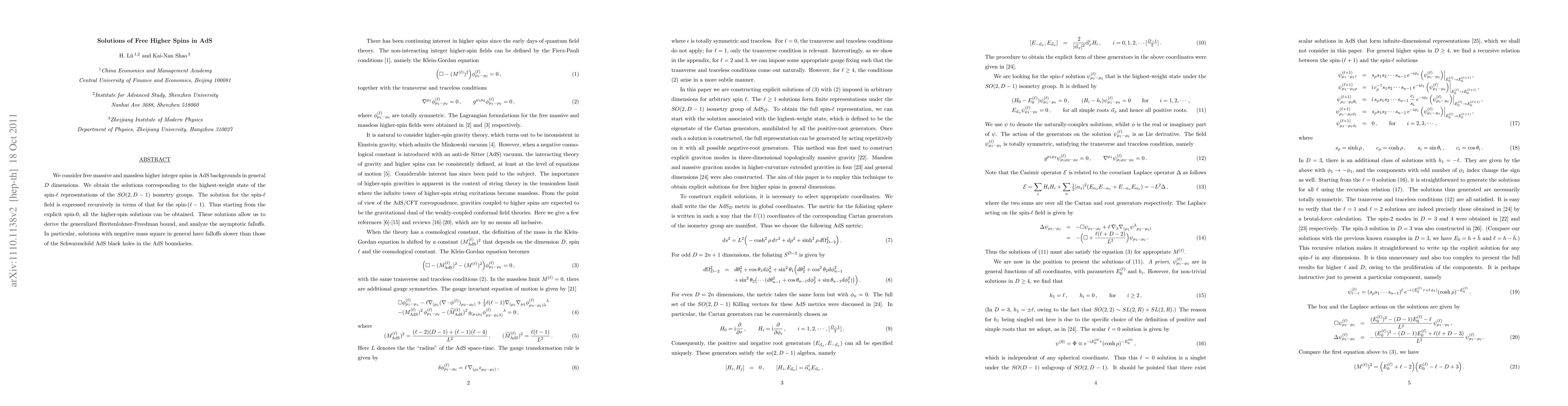This paper derives solutions for free higher integer spins in Anti-de Sitter (AdS) spaces, recursively expressing higher-spin fields in terms of lower-spin ones, and discusses their implications for the generalized Breitenlohner-Freedman mass bound and asymptotic falloffs, revealing that negative mass square solutions exhibit slower falloffs than Schwarzschild AdS black holes.