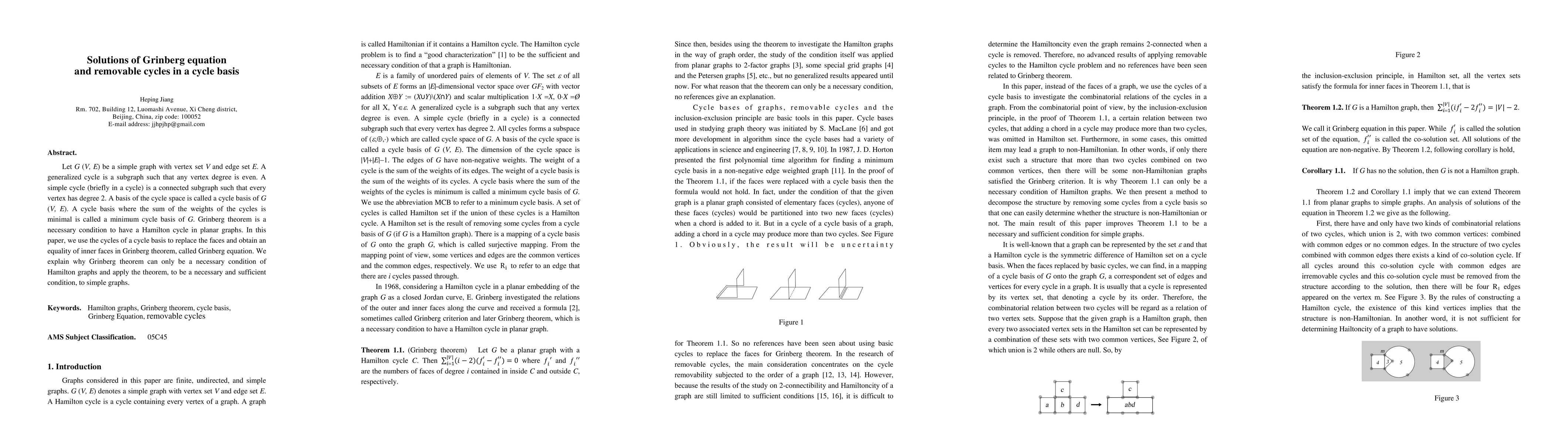 Let G (V, E) be a simple graph with vertex set V and edge set E. A generalized cycle is a subgraph such that any vertex degree is even. A simple cycle (briefly in a cycle) is a connected subgraph such that every vertex has degree 2. A basis of the cycle space is called a cycle basis of G (V, E). A cycle basis where the sum of the weights of the cycles is minimal is called a minimum cycle basis of G. Grinberg theorem is a necessary condition to have a Hamilton cycle in planar graphs. In this paper, we use the cycles of a cycle basis to replace the faces and obtain an equality of inner faces in Grinberg theorem, called Grinberg equation. We explain why Grinberg theorem can only be a necessary condition of Hamilton graphs and apply the theorem, to be a necessary and sufficient condition, to simple graphs.