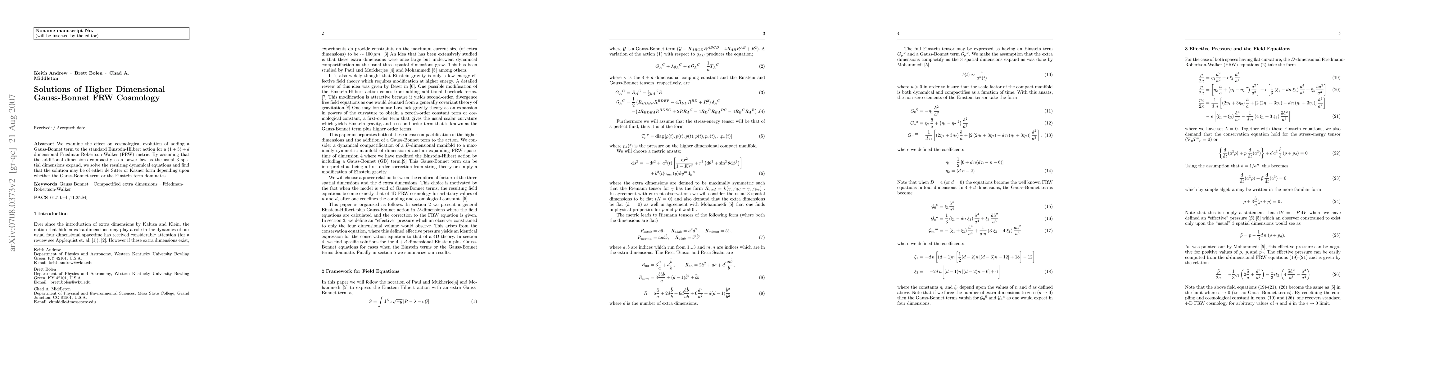 We examine the effect on cosmological evolution of adding a Gauss-Bonnet term to the standard Einstein-Hilbert action for a (1 + 3)+ d dimensional Friedman-Robertson-Walker (FRW) metric. By assuming that the additional dimensions compactify as a power law as the usual 3 spatial dimensions expand, we solve the resulting dynamical equations and find that the solution may be of either de Sitter or Kasner form depending upon whether the Gauss-Bonnet term or the Einstein term dominates.