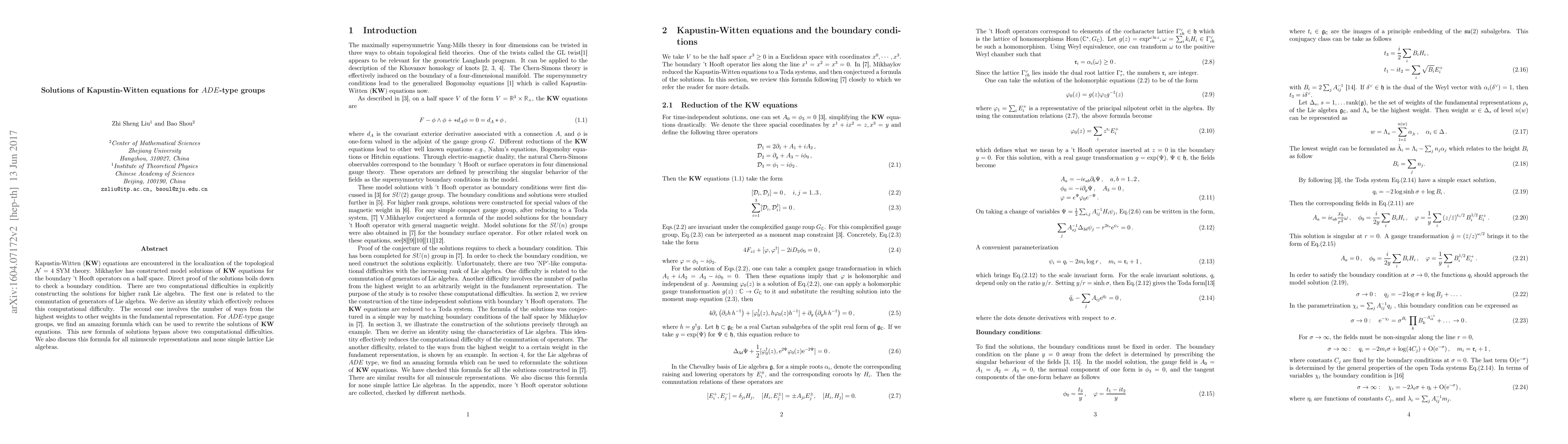 Kapustin-Witten (KW) equations are encountered in the localization of the topological N=4 SYM theory. Mikhaylov has constructed model solutions of KW equations for the boundary 't~Hooft operators on a half space. Direct proof of the solutions boils down to check a boundary condition. There are two computational difficulties in explicitly constructing the solutions to Lie algebra of higher rank. The first one is related to the commutation of generators of Lie algebra. We derived an identity which effectively reduces this computational difficulty. The second one involves the number of ways from the highest weights to other weights in the fundamental representation. For ADE-type gauge groups, we found an amazing formula which can be used to rewrite the solutions of KW equations. This new formula of solutions bypass above two computational difficulties.