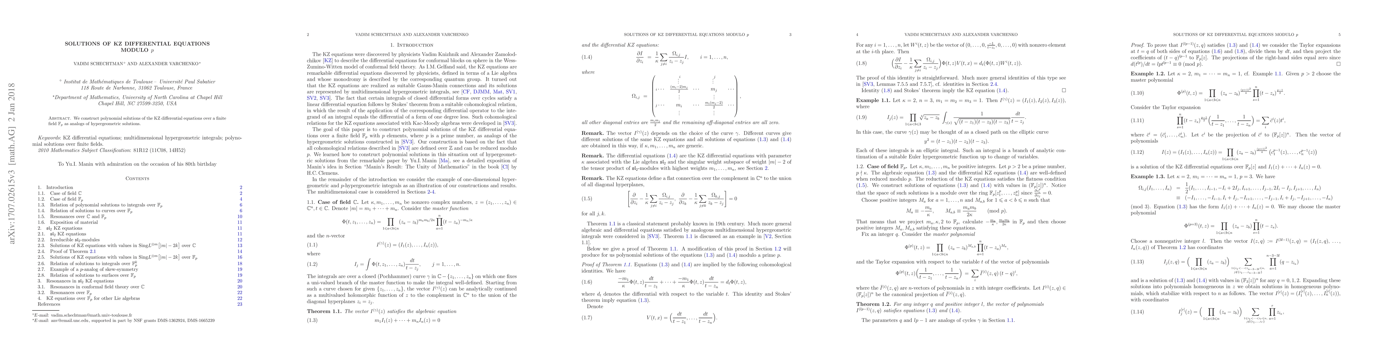 Summary: This paper constructs polynomial solutions of KZ differential equations over the finite field $F_p$, serving as analogs to hypergeometric solutions, providing new insights into the equation's behavior in modular arithmetic.