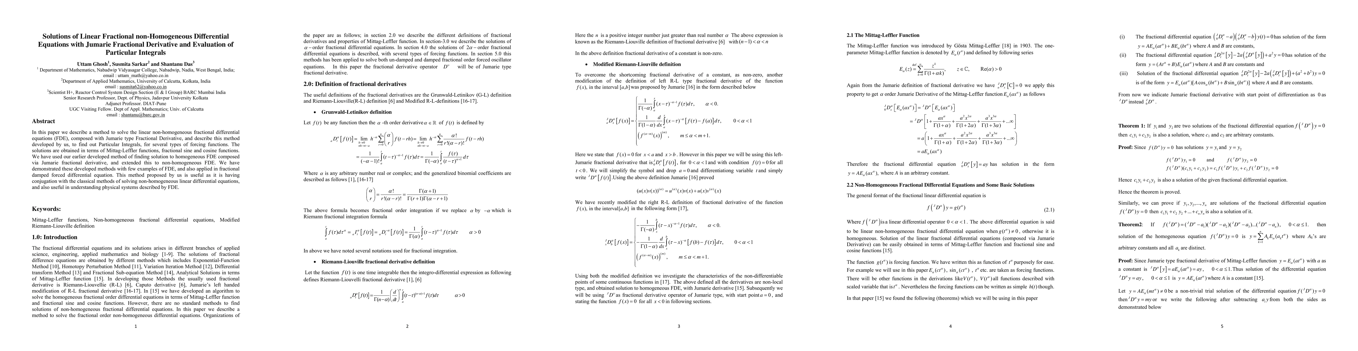 This paper presents a novel method for solving linear non-homogeneous fractional differential equations using Jumarie fractional derivatives, obtaining solutions via Mittag-Leffler functions and fractional sine/cosine functions. The method extends earlier techniques for homogeneous equations and is demonstrated through examples and applications to fractional damped forced differential equations.