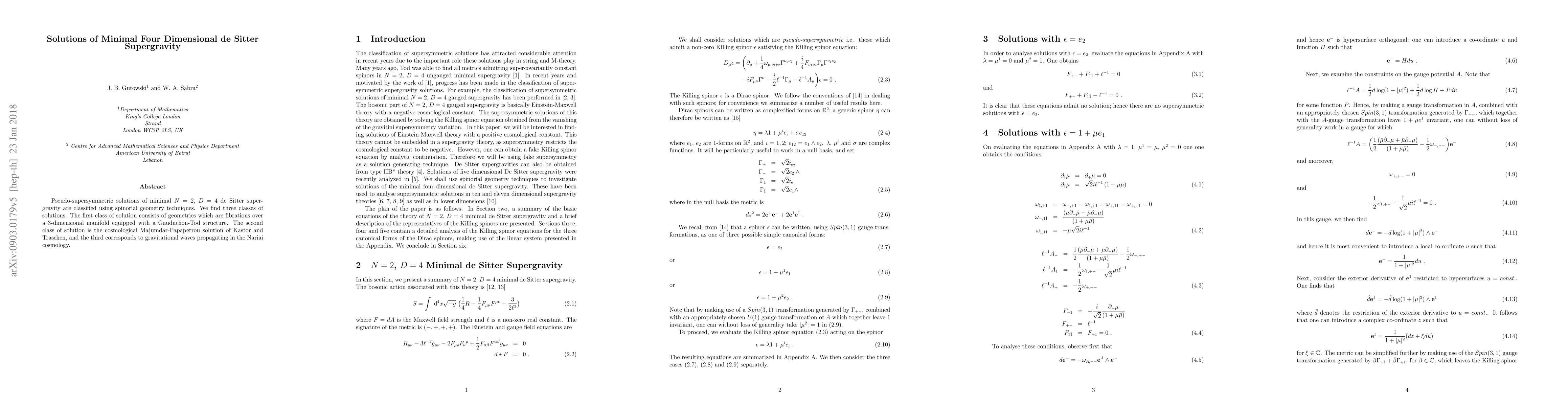 Researchers discovered three classes of minimal four-dimensional de Sitter supergravity solutions using spinorial geometry techniques, including fibrations, the Majumdar-Papapetrou solution, and gravitational waves in Nariai cosmology.