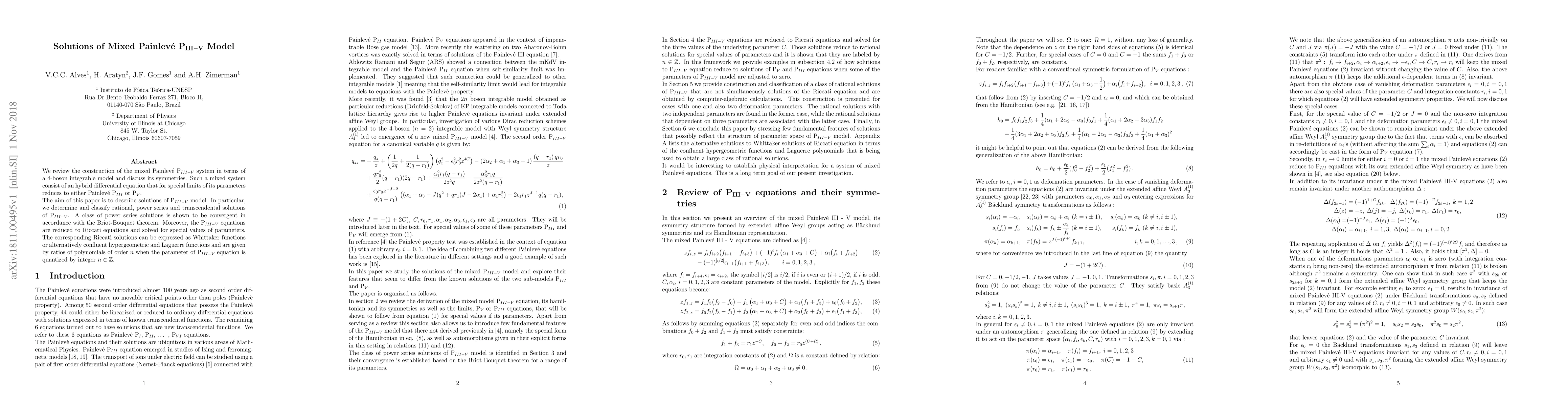 We review the construction of the mixed Painlev\'e P$_{III-V}$ system in terms of a 4-boson integrable model and discuss its symmetries. Such a mixed system consist of an hybrid differential equation that for special limits of its parameters reduces to either Painlev\'e P$_{III}$ or P$_{V}$. The aim of this paper is to describe solutions of P$_{III-V}$ model. In particular, we determine and classify rational, power series and transcendental solutions of P$_{III-V}$. A class of power series solutions is shown to be convergent in accordance with the Briot-Bouquet theorem. Moreover, the P$_{III-V}$ equations are reduced to Riccati equations and solved for special values of parameters. The corresponding Riccati solutions can be expressed as Whittaker functions or alternatively confluent hypergeometric and Laguerre functions and are given by ratios of polynomials of order $n$ when the parameter of P$_{III-V}$ equation is quantized by integer $n \in \mathbb{Z}$.