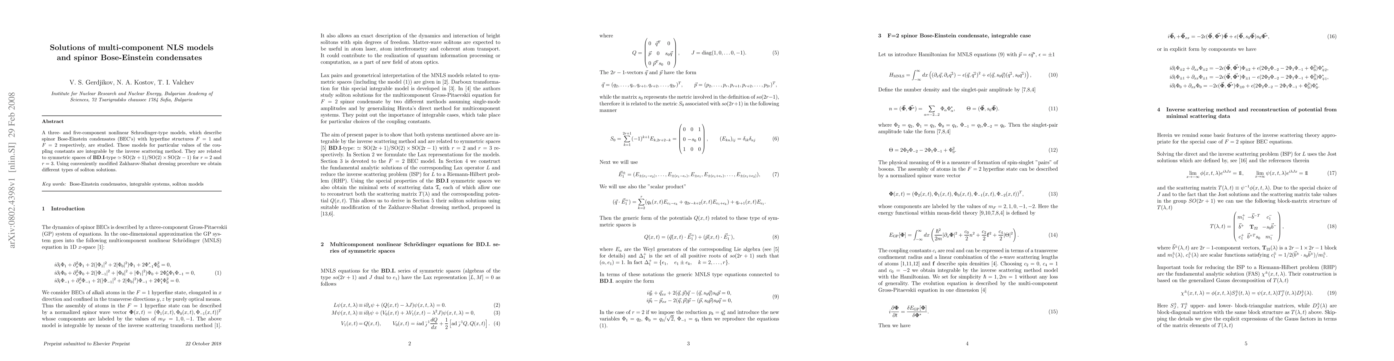 A three- and five-component nonlinear Schrodinger-type models, which describe spinor Bose-Einstein condensates (BEC's) with hyperfine structures F=1 and F=2 respectively, are studied. These models for particular values of the coupling constants are integrable by the inverse scattering method. They are related to symmetric spaces of BD.I-type SO(2r+1)/(SO(2) x SO(2r-1)) for r=2 and r=3. Using conveniently modified Zakharov-Shabat dressing procedure we obtain different types of soliton solutions.