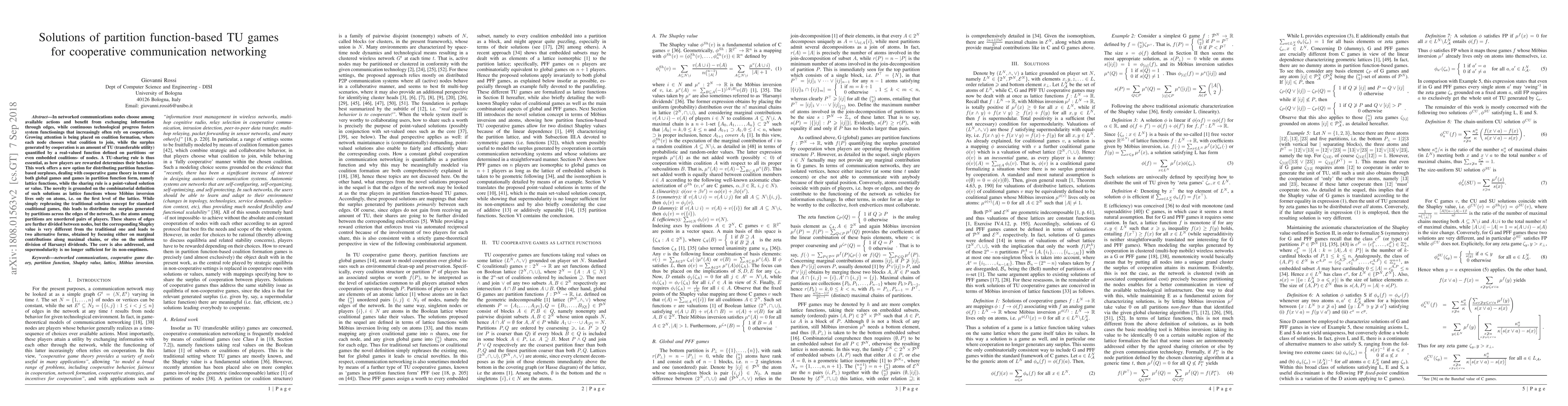 In networked communications nodes choose among available actions and benefit from exchanging information through edges, while continuous technological progress fosters system functionings that increasingly often rely on cooperation. Growing attention is being placed on coalition formation, where each node chooses what coalition to join, while the surplus generated by cooperation is an amount of TU (transferable utility) quantified by a real-valued function defined on partitions -or even embedded coalitions- of nodes. A TU-sharing rule is thus essential, as how players are rewarded determines their behavior. This work offers a new option for distributing partition function-based surpluses, dealing with cooperative game theory in terms of both global games and games in partition function form, namely lattice functions, while the sharing rule is a point-valued solution or value. The novelty is grounded on the combinatorial definition of such solutions as lattice functions whose M\"obius inversion lives only on atoms, i.e. on the first level of the lattice. While simply rephrasing the traditional solution concept for standard coalitional games, this leads to distribute the surplus generated by partitions across the edges of the network, as the atoms among partitions are unordered pairs of players. These shares of edges are further divided between nodes, but the corresponding Shapley value is very different from the traditional one and leads to two alternative forms, obtained by focusing either on marginal contributions along maximal chains, or else on the uniform division of Harsanyi dividends. The core is also addressed, and supermodularity is no longer sufficient for its non-emptiness.