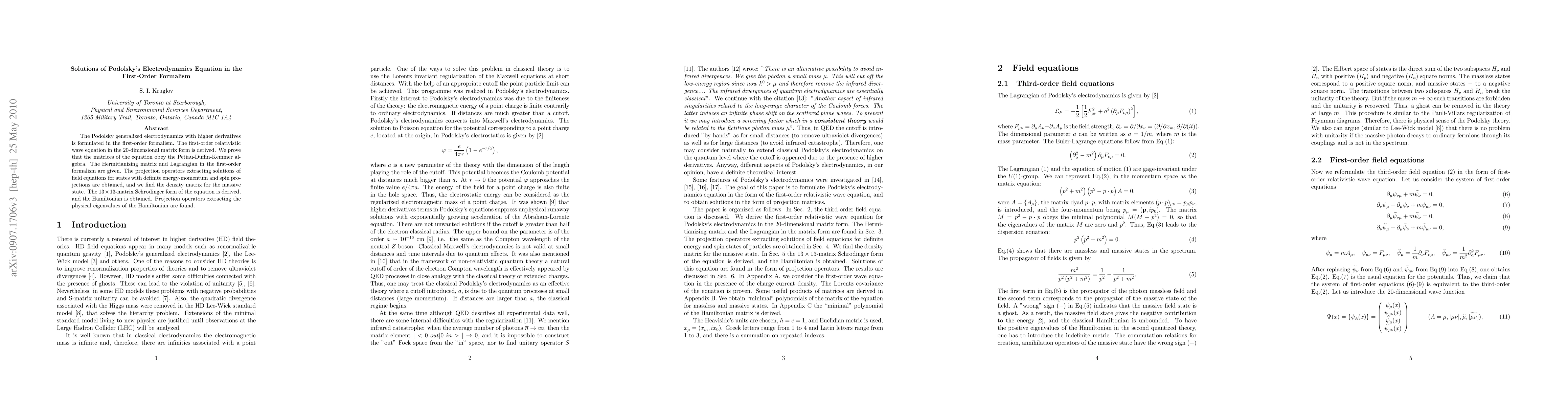 The Podolsky generalized electrodynamics with higher derivatives is formulated in the first-order formalism. The first-order relativistic wave equation in the 20-dimensional matrix form is derived. We prove that the matrices of the equation obey the Petiau-Duffin-Kemmer algebra. The Hermitianizing matrix and Lagrangian in the first-order formalism are given. The projection operators extracting solutions of field equations for states with definite energy-momentum and spin projections are obtained, and we find the density matrix for the massive state. The $13\times 13$-matrix Schrodinger form of the equation is derived, and the Hamiltonian is obtained. Projection operators extracting the physical eigenvalues of the Hamiltonian are found.