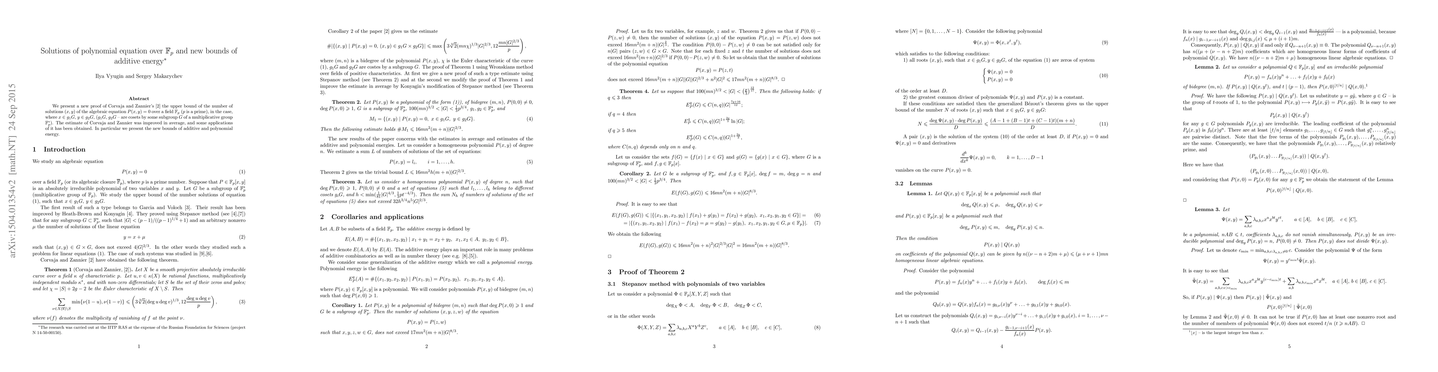 We present a new proof of Corvaja and Zannier's \cite{C-Z} the upper bound of the number of solutions $(x,y)$ of the algebraic equation $P(x,y)=0$ over a field $\mathbb{F}_p$ ($p$ is a prime), in the case, where $x\in g_1G$, $y\in g_2G$, ($g_1G$, $g_2G$ -- are cosets by some subgroup $G$ of a multiplicative group $\mathbb{F}_p^*$). The estimate of Corvaja and Zannier was improved in average, and some applications of it has been obtained. In particular we present the new bounds of additive and polynomial energy.