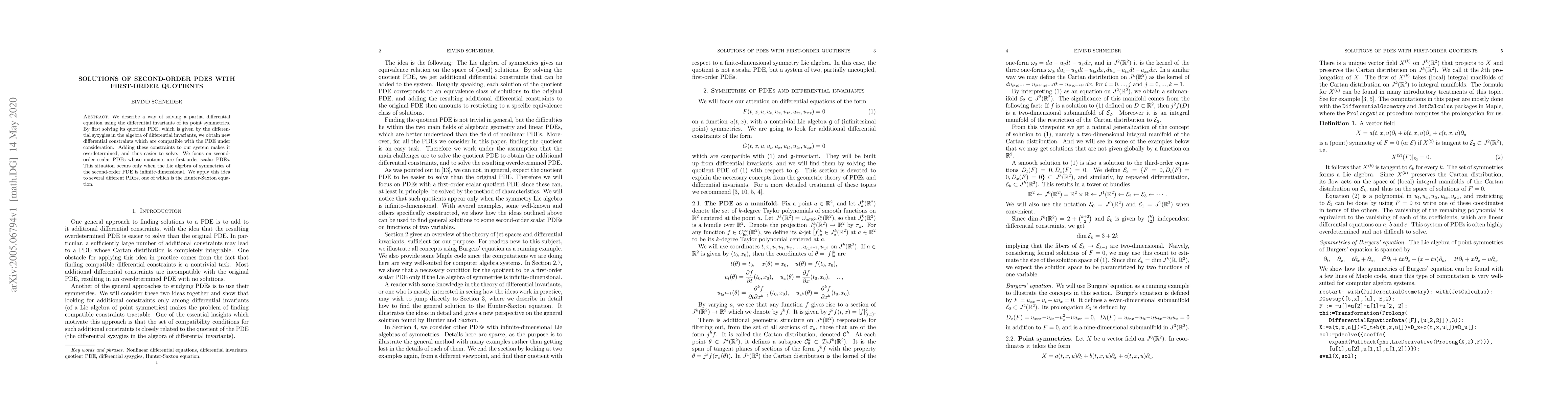 We describe a way of solving a partial differential equation using the differential invariants of its point symmetries. By first solving its quotient PDE, which is given by the differential syzygies in the algebra of differential invariants, we obtain new differential constraints which are compatible with the PDE under consideration. Adding these constraints to our system makes it overdetermined, and thus easier to solve. We focus on second-order scalar PDEs whose quotients are first-order scalar PDEs. This situation occurs only when the Lie algebra of symmetries of the second-order PDE is infinite-dimensional. We apply this idea to several different PDEs, one of which is the Hunter-Saxton equation.
