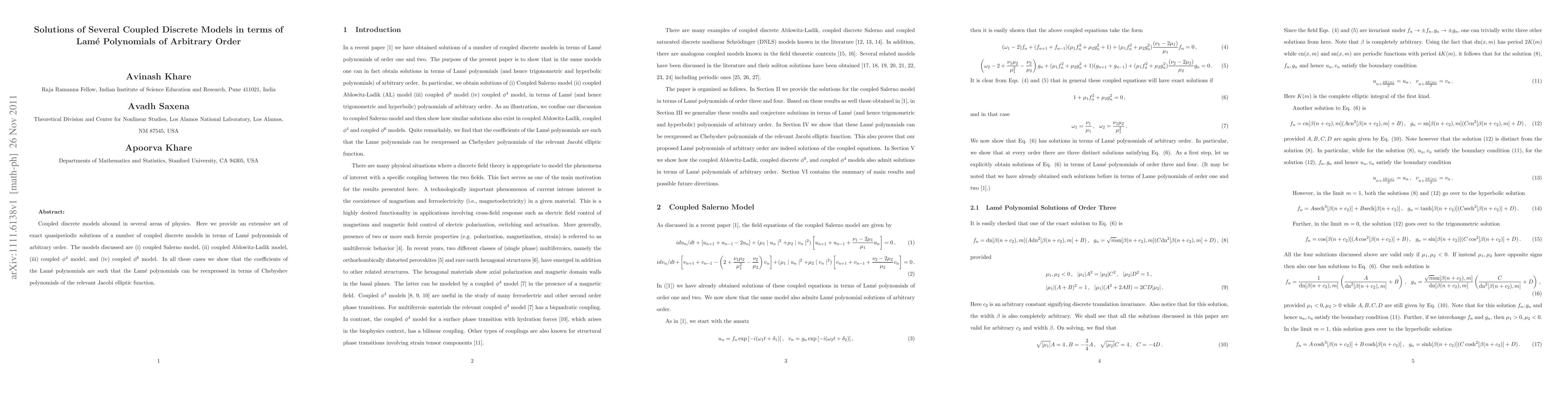 This paper presents exact quasiperiodic solutions for several coupled discrete models—including the Salerno, Ablowitz-Ladik, $\phi^4$, and $\phi^6$ models—using Lam\'e polynomials of arbitrary order. The solutions demonstrate that Lam\'e polynomials can be reexpressed in terms of Chebyshev polynomials of the relevant Jacobi elliptic function.