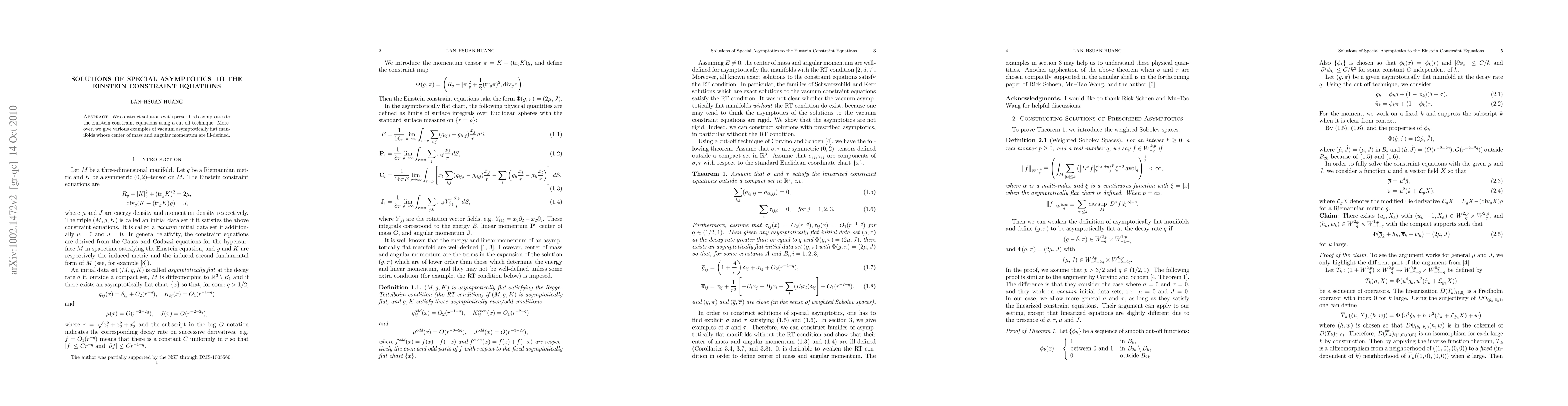 This paper constructs solutions to the Einstein constraint equations with prescribed asymptotic behavior using a cut-off technique. It also provides examples of vacuum asymptotically flat manifolds where the center of mass and angular momentum are not well-defined.