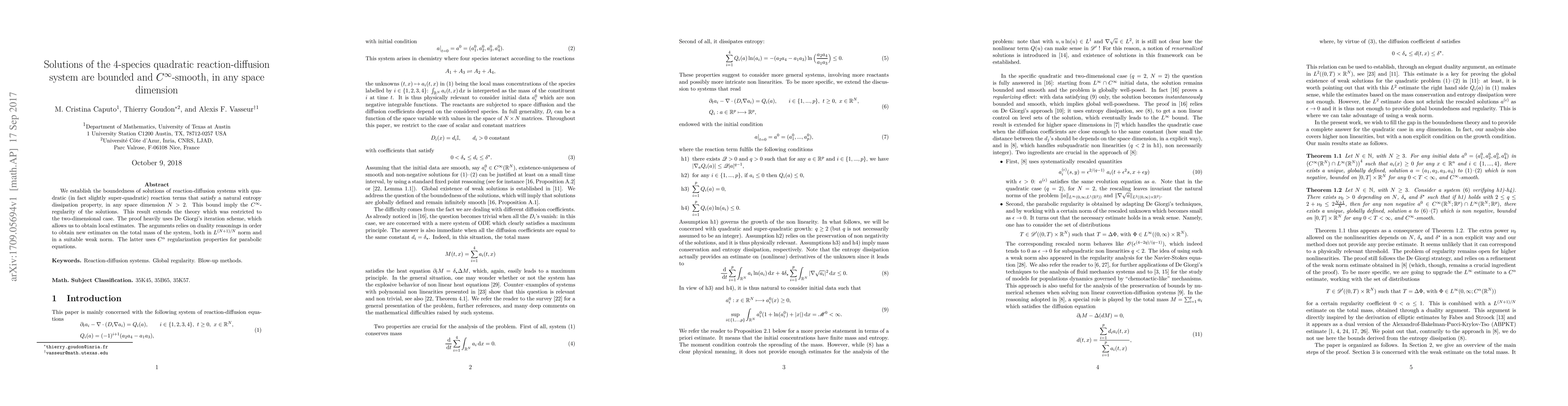 This paper proves the boundedness and $C^\infty$ smoothness of solutions for a 4-species quadratic reaction-diffusion system in any space dimension $N>2$. The authors extend previous results limited to two dimensions, utilizing De Giorgi's iteration scheme and duality reasoning to derive new estimates on the system's total mass.