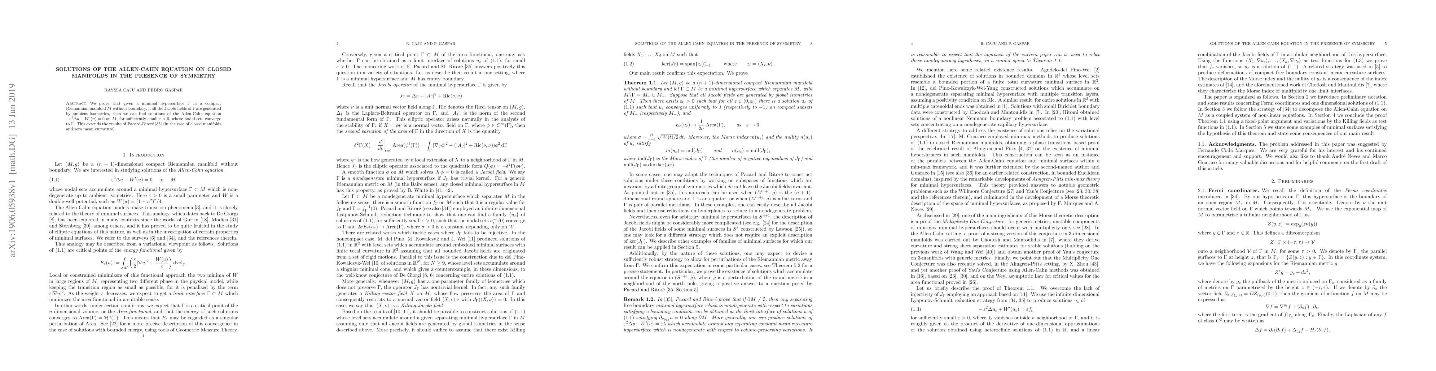 The paper proves that under specific conditions, solutions of the Allen-Cahn equation on a compact Riemannian manifold converge to the nodal sets of minimal hypersurfaces, extending previous work by Pacard-Ritoré. This links ambient isometry-generated Jacobi fields of minimal hypersurfaces with solutions of the Allen-Cahn equation.