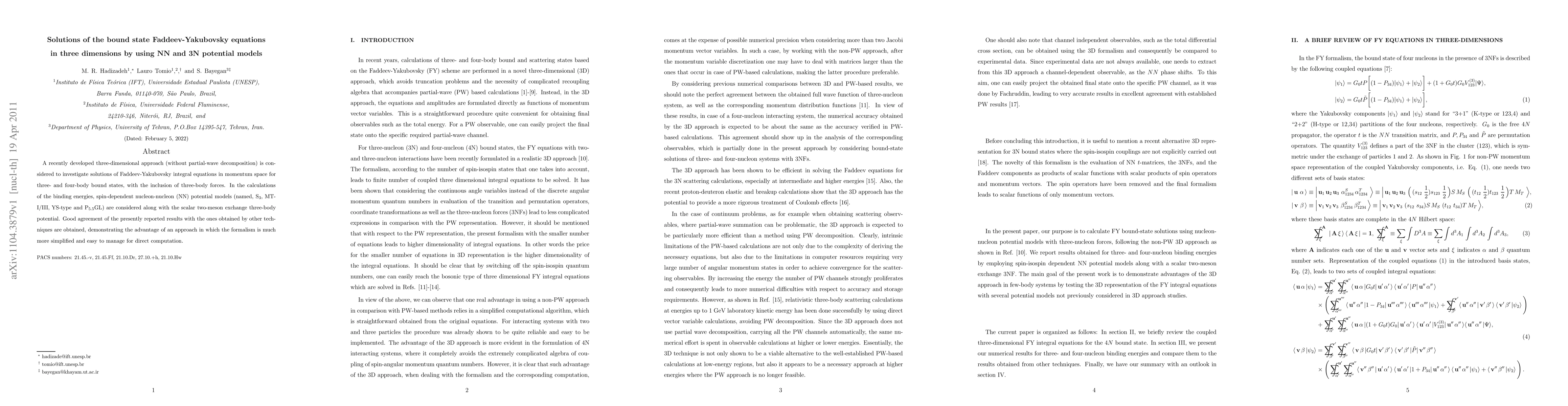This paper investigates three-dimensional solutions of Faddeev-Yakubovsky equations for three- and four-body bound states using a simplified momentum-space approach without partial-wave decomposition. It compares binding energies calculated with various NN and 3N potential models, showing good agreement with other methods and highlighting the simplicity of the proposed formalism.