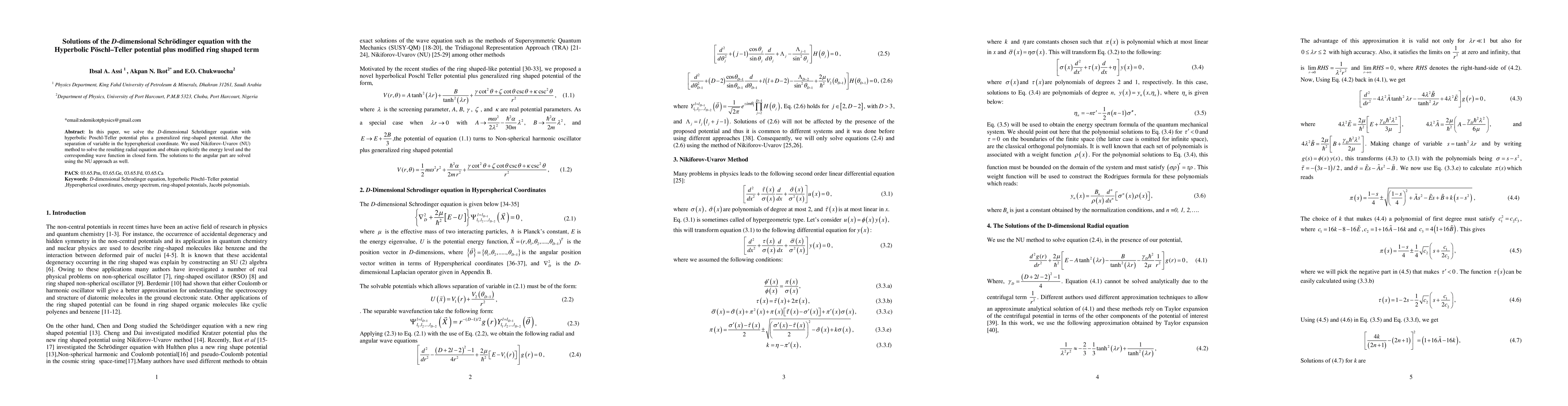 This paper solves the D-dimensional Schrödinger equation with a hyperbolic Poschl-Teller potential and a modified ring-shaped term. Using the Nikiforov-Uvarov method, it derives explicit closed-form solutions for both the radial and angular parts of the wave function and energy levels.