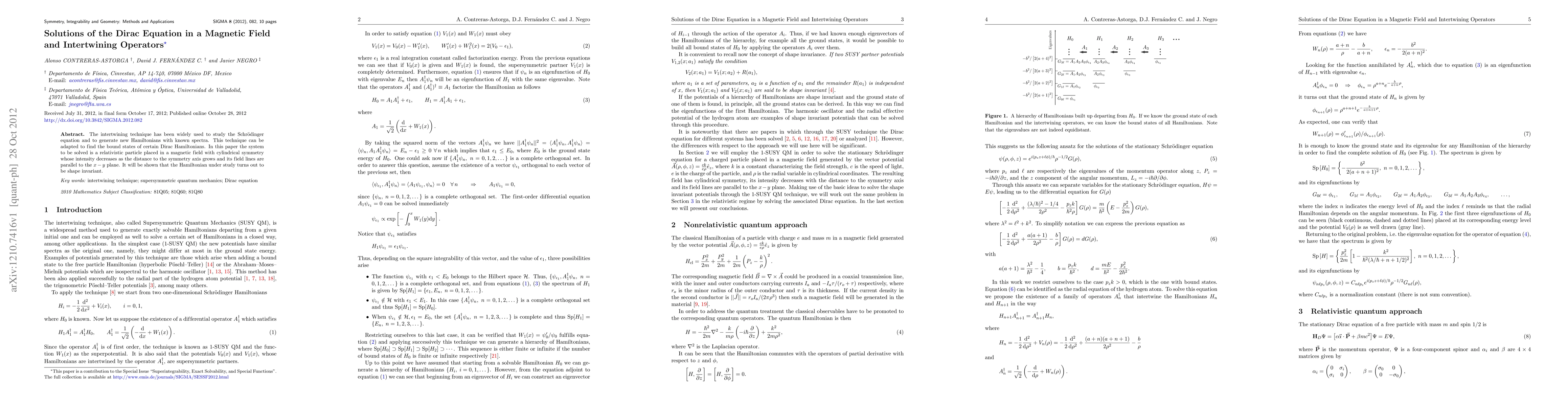 This paper explores the intertwining technique to solve the Dirac equation for a relativistic particle in a magnetic field with cylindrical symmetry, demonstrating that the Hamiltonian is shape invariant and generating new Hamiltonians with known spectra.