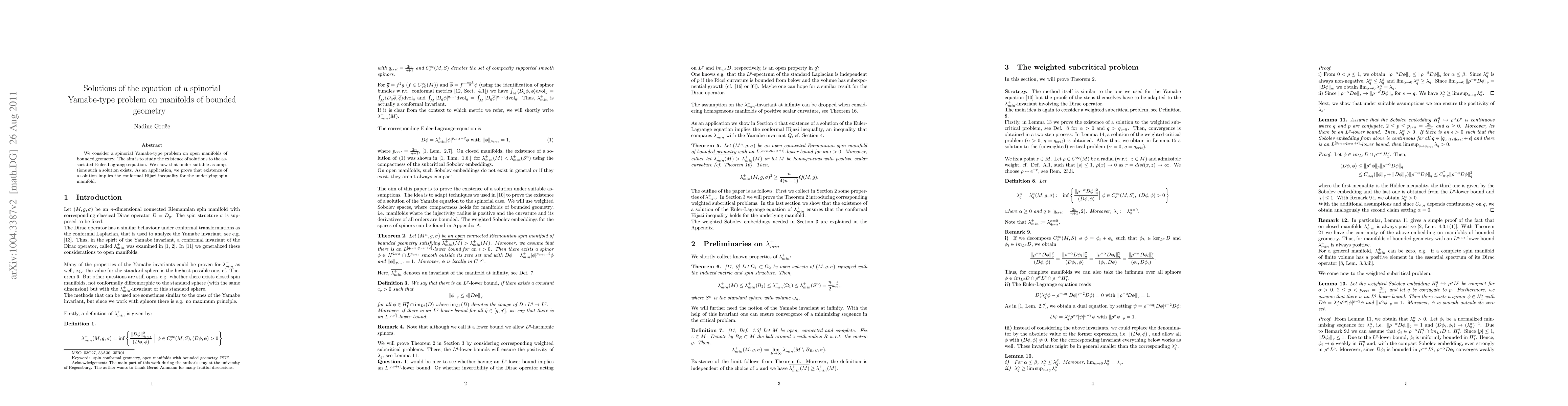 The paper investigates solutions to a spinorial Yamabe-type problem on open manifolds with bounded geometry, proving the existence of such solutions under specific conditions and demonstrating their implication in establishing the conformal Hijazi inequality.