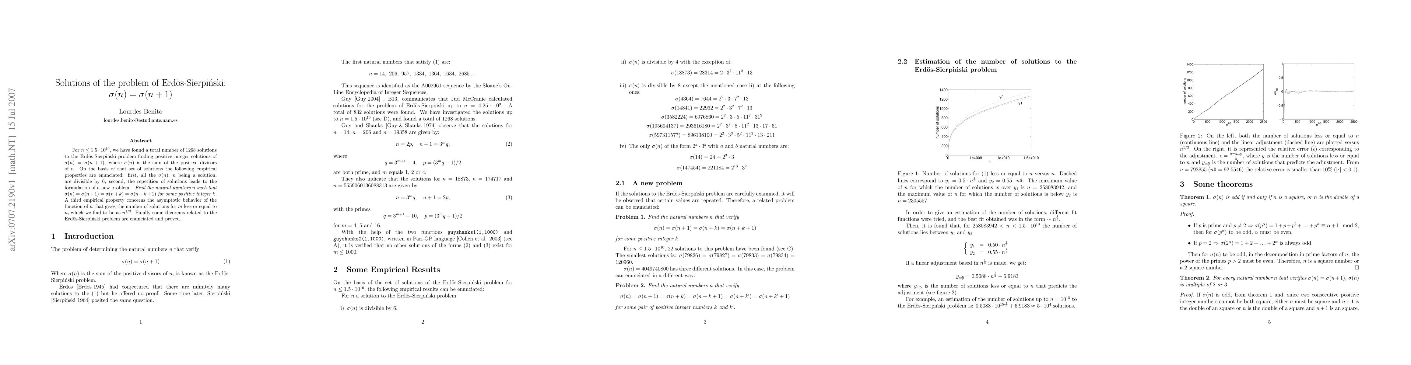 For $n\leq 1.5 \cdot 10^{10}$, we have found a total number of 1268 solutions to the Erd\"os-Sierpi\'nski problem finding positive integer solutions of $\sigma(n)=\sigma(n+1)$, where $\sigma(n)$ is the sum of the positive divisors of n. On the basis of that set of solutions the following empirical properties are enunciated: first, all the $\sigma(n)$, $n$ being a solution, are divisible by 6; second, the repetition of solutions leads to the formulation of a new problem: \emph{Find the natural numbers $n$ such that $\sigma(n)=\sigma(n+1)=\sigma(n+k)=\sigma(n+k+1)$ for some positive integer $k$}. A third empirical property concerns the asymptotic behavior of the function of $n$ that gives the number of solutions for $m$ less or equal to $n$, which we find to be as $n^{1/3}$. Finally some theorems related to the Erd\"os-Sierpi\'nski problem are enunciated and proved.