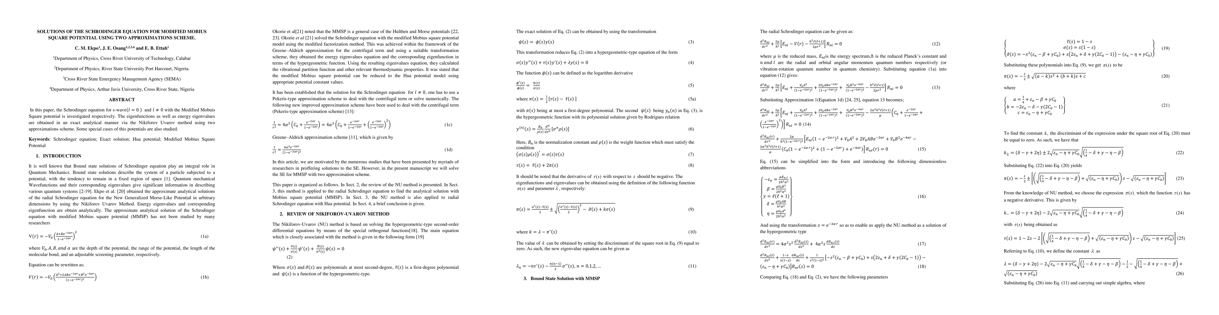 In this paper, the Schrodinger equation for s-wave and arbitrary angular momenta with the Modified Mobuis Square potential is investigated respectively. The eigenfunctions as well as energy eigenvalues are obtained in an exact analytical manner via the Nikiforov Uvarov method using two approximations scheme. Some special cases of this potentials are also studied.