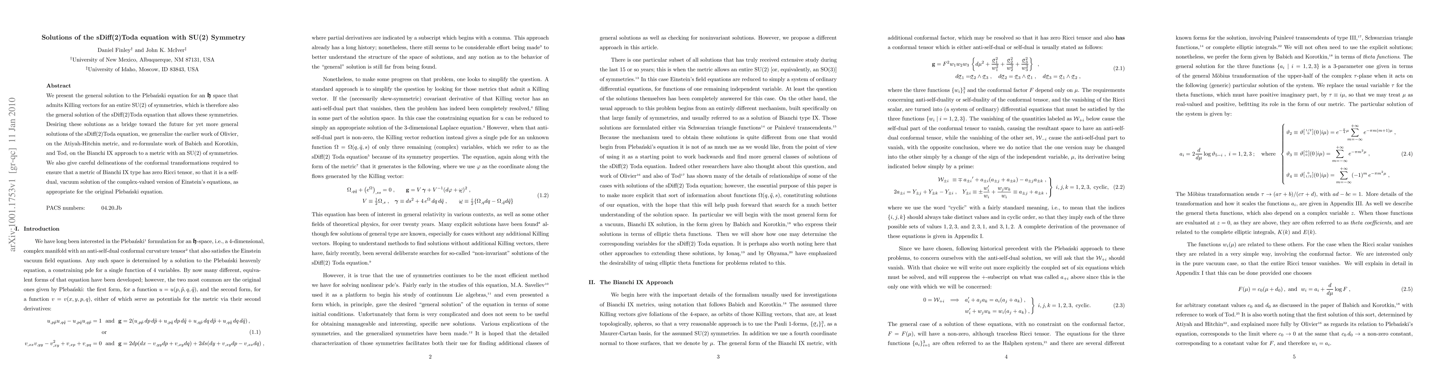 We present the general solution to the Plebanski equation for an H-space that admits Killing vectors for an entire SU(2) of symmetries, which is therefore also the general solution of the sDiff(2)Toda equation that allows these symmetries. Desiring these solutions as a bridge toward the future for yet more general solutions of the sDiff(2)Toda equation, we generalize the earlier work of Olivier, on the Atiyah-Hitchin metric, and re-formulate work of Babich and Korotkin, and Tod, on the Bianchi IX approach to a metric with an SU(2) of symmetries. We also give careful delineations of the conformal transformations required to ensure that a metric of Bianchi IX type has zero Ricci tensor, so that it is a self-dual, vacuum solution of the complex-valued version of Einstein's equations, as appropriate for the original Plebanski equation.