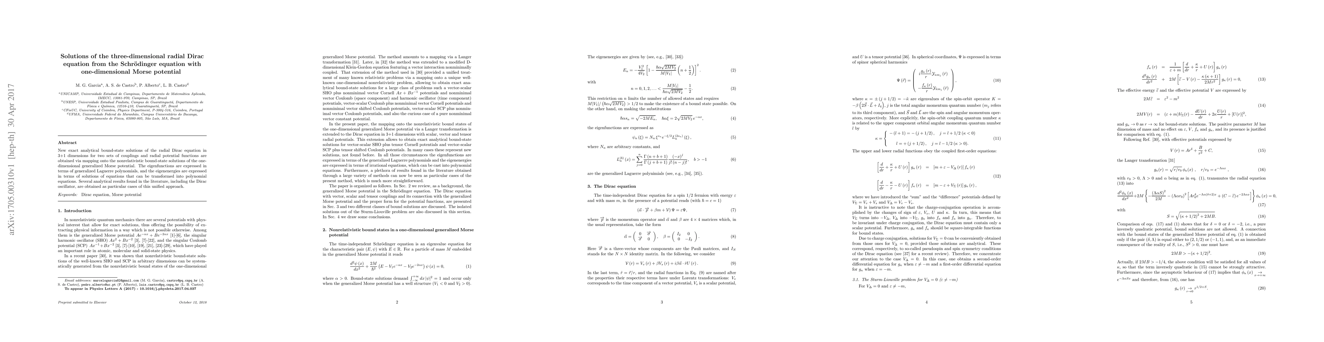 New exact analytical bound-state solutions of the radial Dirac equation in 3+1 dimensions for two sets of couplings and radial potential functions are obtained via mapping onto the nonrelativistic bound-state solutions of the one-dimensional generalized Morse potential. The eigenfunctions are expressed in terms of generalized Laguerre polynomials, and the eigenenergies are expressed in terms of solutions of equations that can be transformed into polynomial equations. Several analytical results found in the literature, including the Dirac oscillator, are obtained as particular cases of this unified approach.