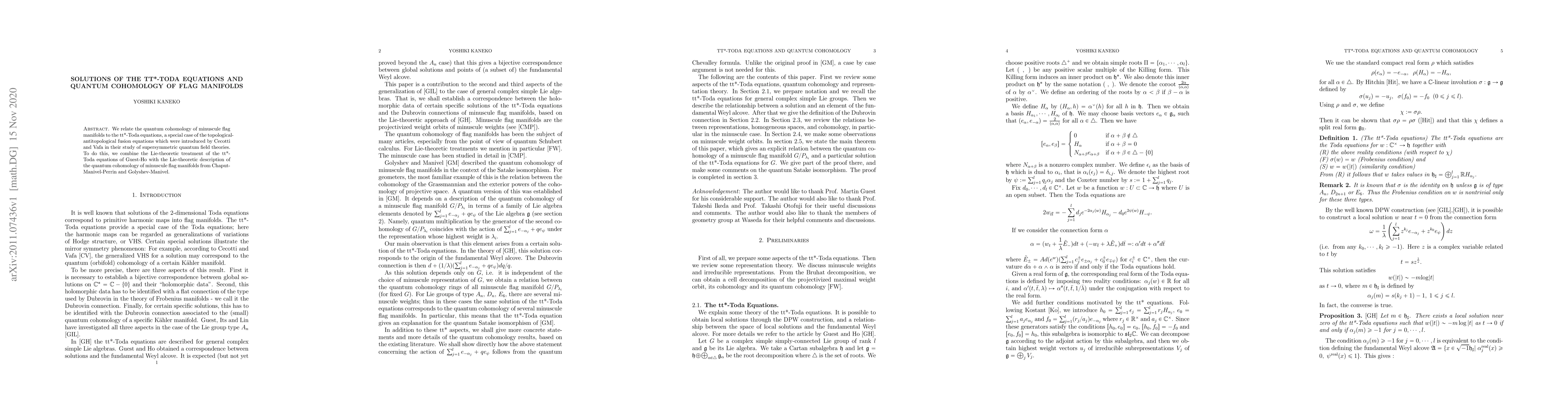 This paper connects the quantum cohomology of minuscule flag manifolds to the tt*-Toda equations, utilizing the Lie-theoretic approaches of both Guest-Ho and Chaput-Manivel-Perrin, and Golyshev-Manivel to achieve the relationship.