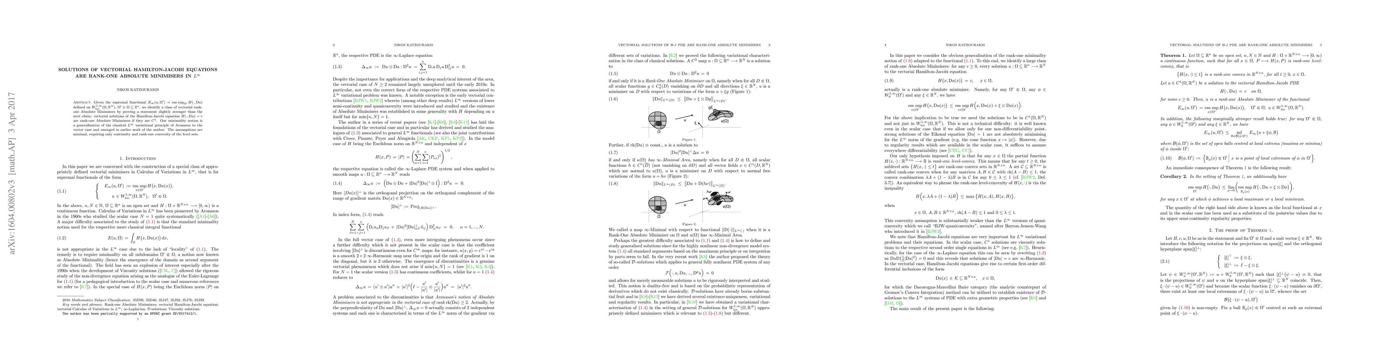 Given the supremal functional $E_\infty(u,\Omega')=ess\,\sup_{\Omega'} H(\cdot,D u)$ defined on $W^{1,\infty}_{loc}(\Omega,\mathbb{R}^N)$, $\Omega' \Subset \Omega\subseteq \mathbb{R}^n$, we identify a class of vectorial rank-one Absolute Minimisers by proving a statement slightly stronger than the next claim: vectorial solutions of the Hamilton-Jacobi equation $H(\cdot,D u)=c$ are rank-one Absolute Minimisers if they are $C^1$. Our minimality notion is a generalisation of the classical $L^\infty$ variational principle of Aronsson to the vector case and emerged in earlier work of the author. The assumptions are minimal, requiring only continuity and rank-one convexity of the level sets.