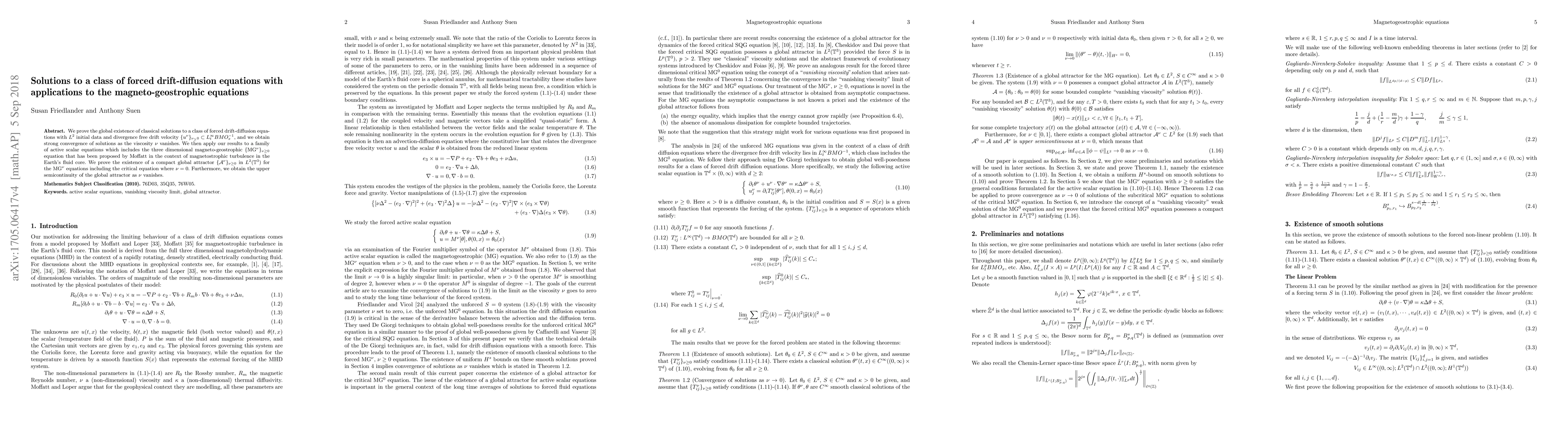 This paper proves the global existence of classical solutions for forced drift-diffusion equations with $L^2$ initial data and demonstrates strong convergence as viscosity vanishes. It applies these results to the magneto-geostrophic equations, proving the existence of a compact global attractor in $L^2(\mathbb{T}^3)$ and upper semicontinuity as viscosity approaches zero.