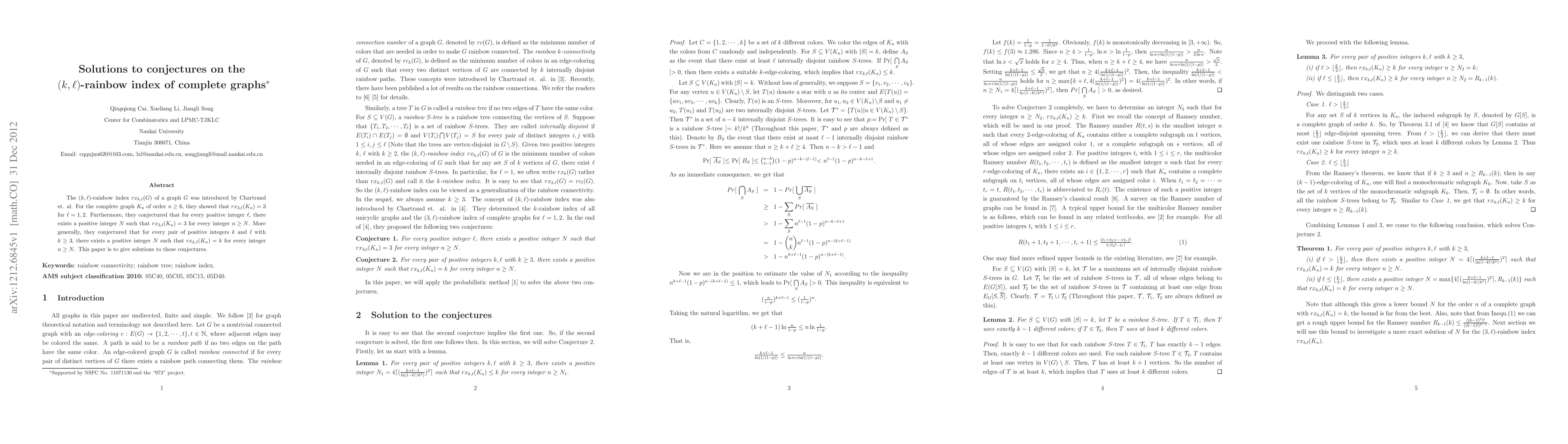 The $(k,\ell)$-rainbow index $rx_{k, \ell}(G)$ of a graph $G$ was introduced by Chartrand et. al. For the complete graph $K_n$ of order $n\geq 6$, they showed that $rx_{3,\ell}(K_n)=3$ for $\ell=1,2$. Furthermore, they conjectured that for every positive integer $\ell$, there exists a positive integer $N$ such that $rx_{3,\ell}(K_{n})=3$ for every integer $n \geq N$. More generally, they conjectured that for every pair of positive integers $k$ and $\ell$ with $k\geq 3$, there exists a positive integer $N$ such that $rx_{k,\ell}(K_{n})=k$ for every integer $n \geq N$. This paper is to give solutions to these conjectures.