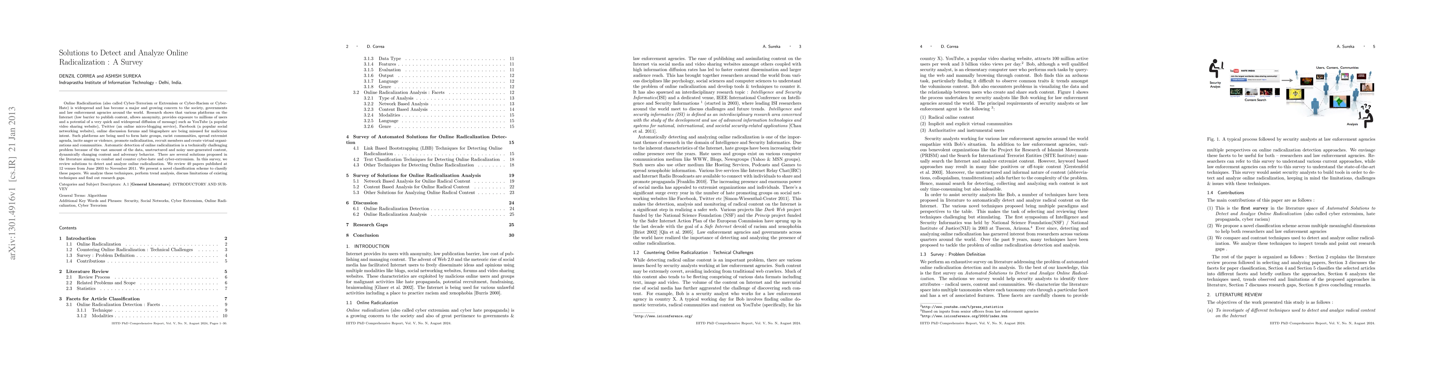 Online Radicalization (also called Cyber-Terrorism or Extremism or Cyber-Racism or Cyber- Hate) is widespread and has become a major and growing concern to the society, governments and law enforcement agencies around the world. Research shows that various platforms on the Internet (low barrier to publish content, allows anonymity, provides exposure to millions of users and a potential of a very quick and widespread diffusion of message) such as YouTube (a popular video sharing website), Twitter (an online micro-blogging service), Facebook (a popular social networking website), online discussion forums and blogosphere are being misused for malicious intent. Such platforms are being used to form hate groups, racist communities, spread extremist agenda, incite anger or violence, promote radicalization, recruit members and create virtual organi- zations and communities. Automatic detection of online radicalization is a technically challenging problem because of the vast amount of the data, unstructured and noisy user-generated content, dynamically changing content and adversary behavior. There are several solutions proposed in the literature aiming to combat and counter cyber-hate and cyber-extremism. In this survey, we review solutions to detect and analyze online radicalization. We review 40 papers published at 12 venues from June 2003 to November 2011. We present a novel classification scheme to classify these papers. We analyze these techniques, perform trend analysis, discuss limitations of existing techniques and find out research gaps.