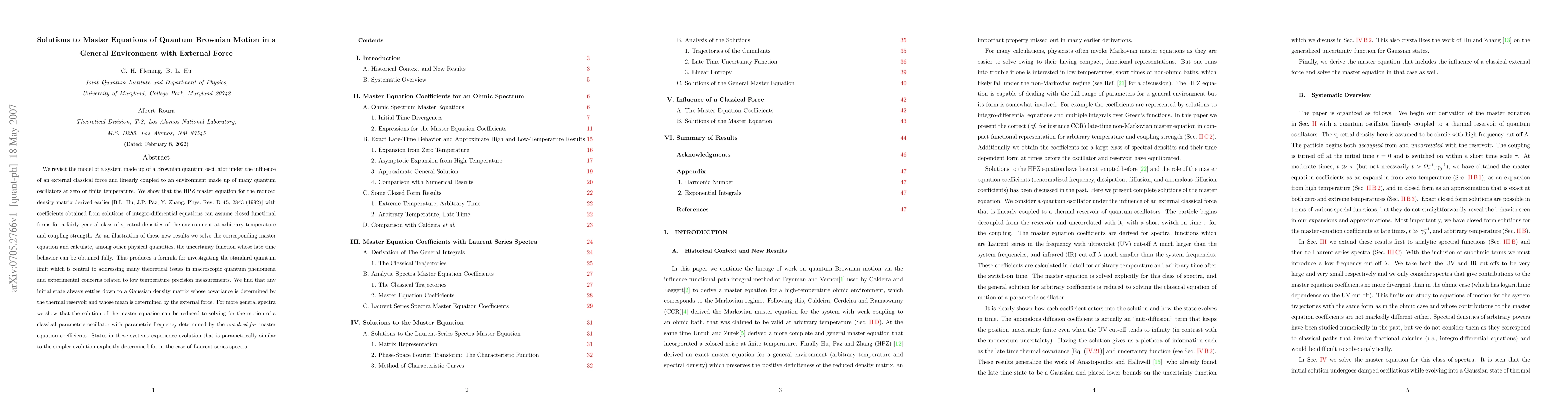 We revisit the model of a system made up of a Brownian quantum oscillator under the influence of an external classical force and linearly coupled to an environment made up of many quantum oscillators at zero or finite temperature. We show that the HPZ master equation for the reduced density matrix derived earlier [B.L. Hu, J.P. Paz, Y. Zhang, Phys. Rev. D 45, 2843 (1992)] with coefficients obtained from solutions of integro-differential equations can assume closed functional forms for a fairly general class of spectral densities of the environment at arbitrary temperature and coupling strength. As an illustration of these new results we solve the corresponding master equation and calculate, among other physical quantities, the uncertainty function whose late time behavior can be obtained fully. This produces a formula for investigating the standard quantum limit which is central to addressing many theoretical issues in macroscopic quantum phenomena and experimental concerns related to low temperature precision measurements. We find that any initial state always settles down to a Gaussian density matrix whose covariance is determined by the thermal reservoir and whose mean is determined by the external force. For more general spectra we show that the solution of the master equation can be reduced to solving for the motion of a classical parametric oscillator with parametric frequency determined by the unsolved for master equation coefficients. States in these systems experience evolution that is parametrically similar to the simpler evolution explicitly determined for in the case of Laurent-series spectra.
