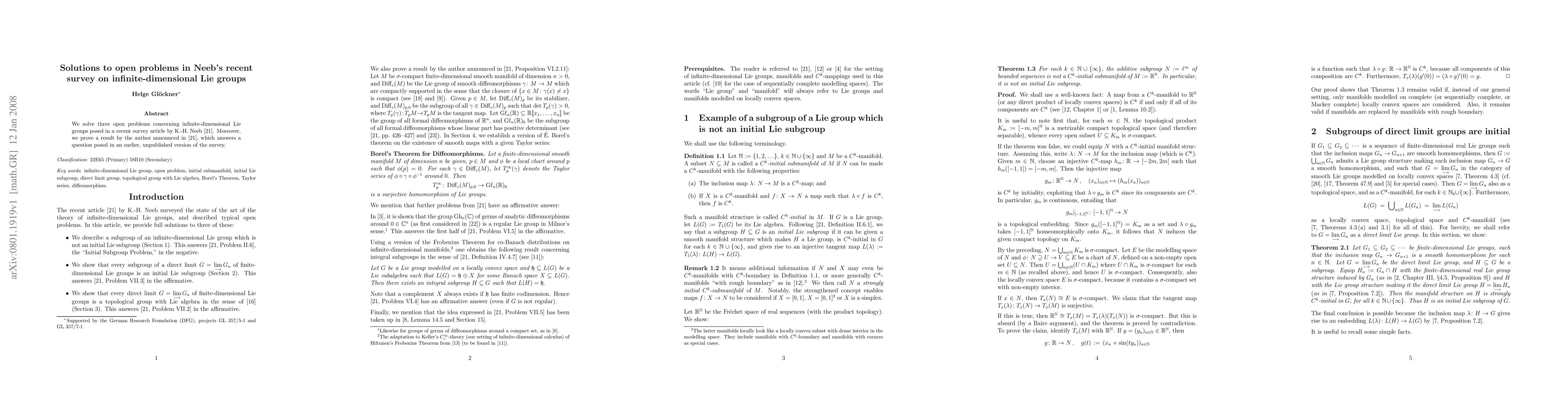 We solve three open problems concerning infinite-dimensional Lie groups posed in a recent survey article by K.-H. Neeb: (1) There exists a subgroup of some infinite-dimensional Lie group G which does not admit an initial Lie subgroup structure; (2) The pathology cannot occur if G is a direct limit of an ascending sequence of finite-dimensional Lie groups; (3) Every such direct limit group is a ``topological group with Lie algebra'' in the sense of Hofmann and Morris. Moreover, we prove a version of Borel's Theorem announced in the survey, ensuring the existence of compactly supported smooth diffeomorphisms with given Taylor series around a fixed point p (provided the tangent map at p has positive determinant).