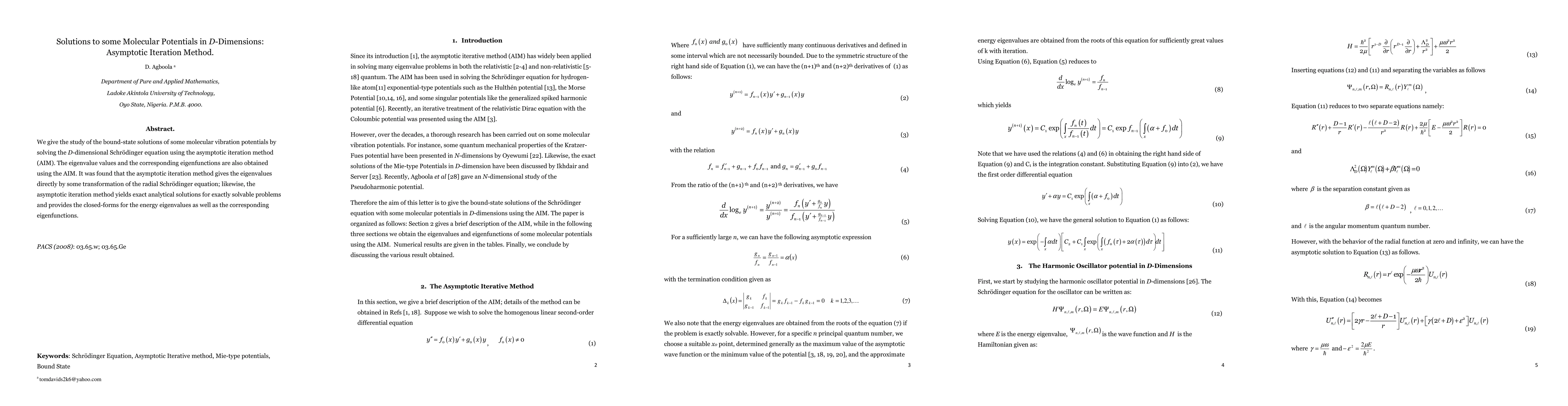We give a study of some molecular vibration potentials by solving the D-dimensional Schrodinger equation using the asymptotic iteration method (AIM). The eigenvalue values obtained by the AIM are found to agree with analytic solutions. The corresponding eigenfunctions are also obtained using the AIM