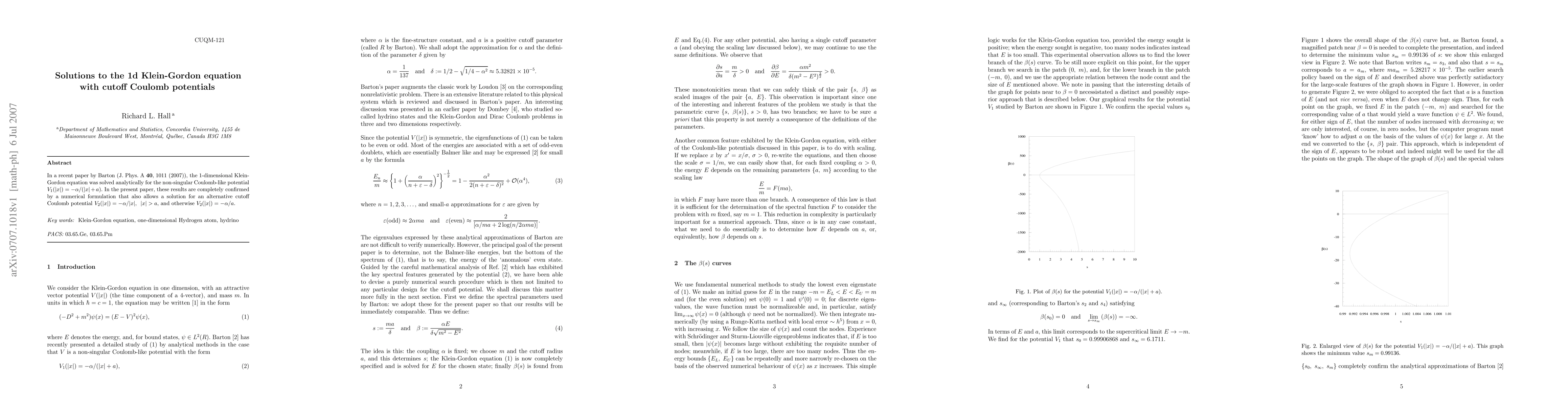 Researchers confirmed solutions to the 1D Klein-Gordon equation for two types of cutoff Coulomb potentials using numerical methods, extending previous results.