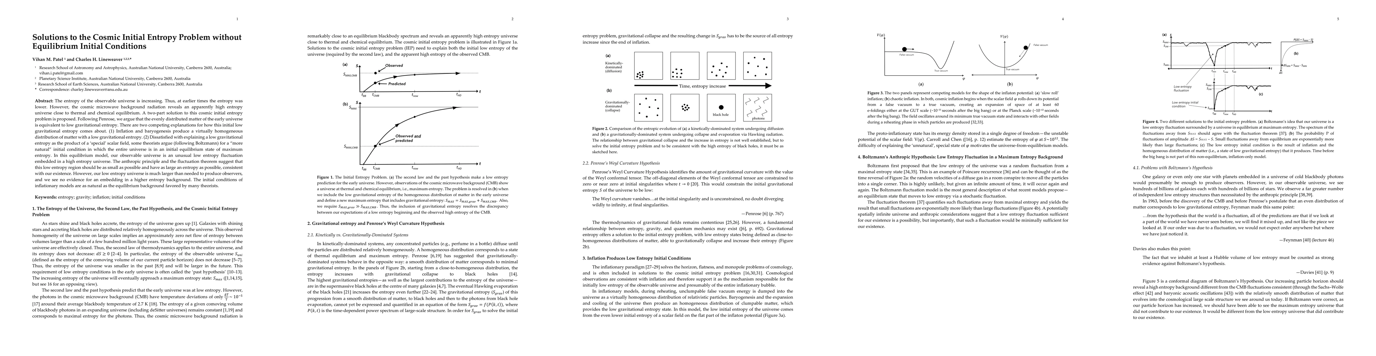 The paper proposes a two-part solution to the cosmic initial entropy problem, suggesting that low gravitational entropy in the early universe is either due to inflation and baryogenesis or an initial equilibrium state of maximum entropy. It argues that the latter explanation is less plausible due to the size of our observable universe and lack of evidence for an embedding in a higher entropy background.