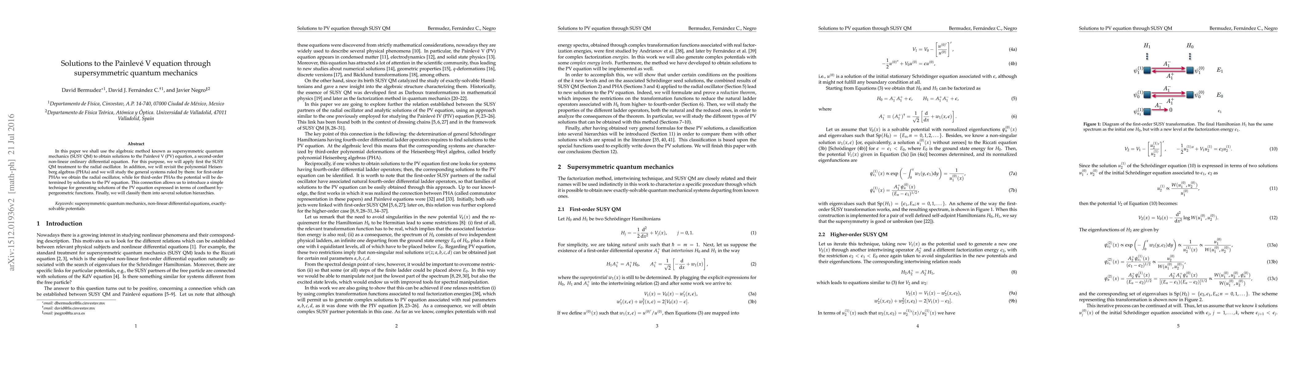 In this paper we shall use the algebraic method known as supersymmetric quantum mechanics (SUSY QM) to obtain solutions to the Painlev\'e V (PV) equation, a second-order non-linear ordinary differential equation. For this purpose, we will apply first the SUSY QM treatment to the radial oscillator. In addition, we will revisit the polynomial Heisenberg algebras (PHAs) and we will study the general systems ruled by them: for first-order PHAs we obtain the radial oscillator, while for third-order PHAs the potential will be determined by solutions to the PV equation. This connection allows us to introduce a simple technique for generating solutions of the PV equation expressed in terms of confluent hypergeometric functions. Finally, we will classify them into several solution hierarchies.