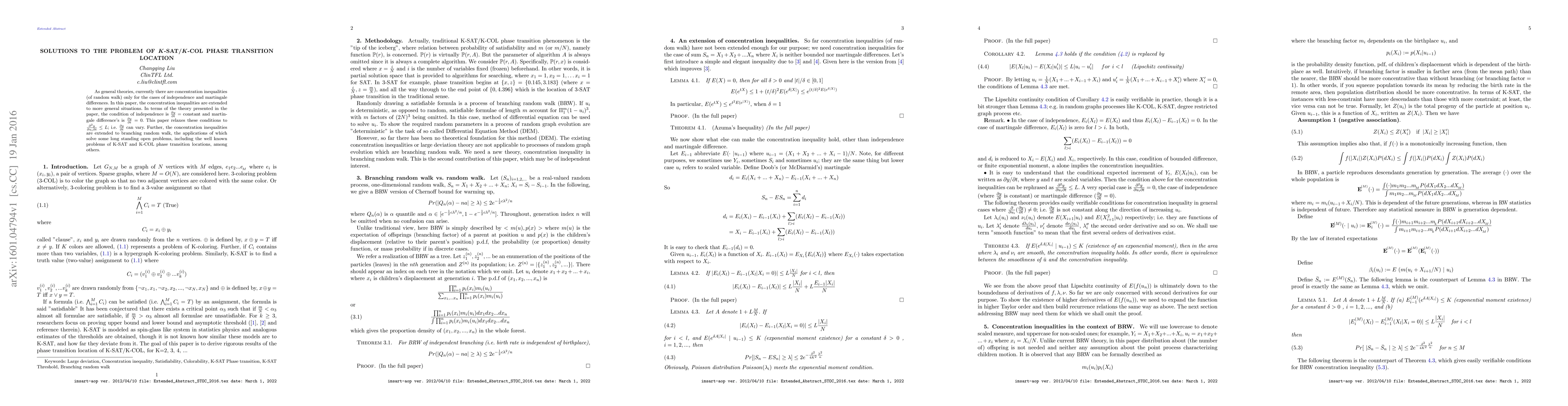 As general theories, currently there are concentration inequalities (of random walk) only for the cases of independence and martingale differences. In this paper, the concentration inequalities are extended to more general situations. In terms of the theory presented in the paper, the condition of independence is $\frac { \partial y } {\partial t}=$ constant and martingale difference's is $\frac { \partial y } {\partial t} = 0 $. This paper relaxes these conditions to $\frac { \partial^2 y } {\partial u_i \partial t} \le L$; i.e. $\frac { \partial y } {\partial t}$ can vary. Further, the concentration inequalities are extended to branching random walk, the applications of which solve some long standing open problems, including the well known problems of K-SAT and K-COL phase transition locations, among others.