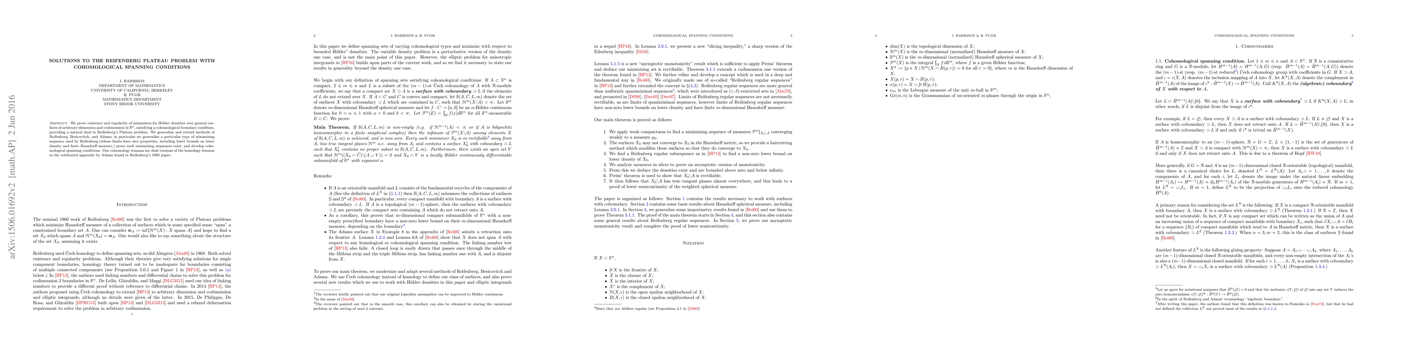 We prove existence and regularity of minimizers for H\"older densities over general surfaces of arbitrary dimension and codimension in \(\R^n \), satisfying a cohomological boundary condition, providing a natural dual to Reifenberg's Plateau problem. We generalize and extend methods of Reifenberg, Besicovitch, and Adams, in particular we generalize a particular type of minimizing sequence used by Reifenberg (whose limits have nice properties, including lower bounds on lower density and finite Hausdorff measure,) prove such minimizing sequences exist, and develop cohomological spanning conditions. Our cohomology lemmas are dual versions of the homology lemmas in the celebrated appendix by Adams found in Reifenberg's 1960 paper.