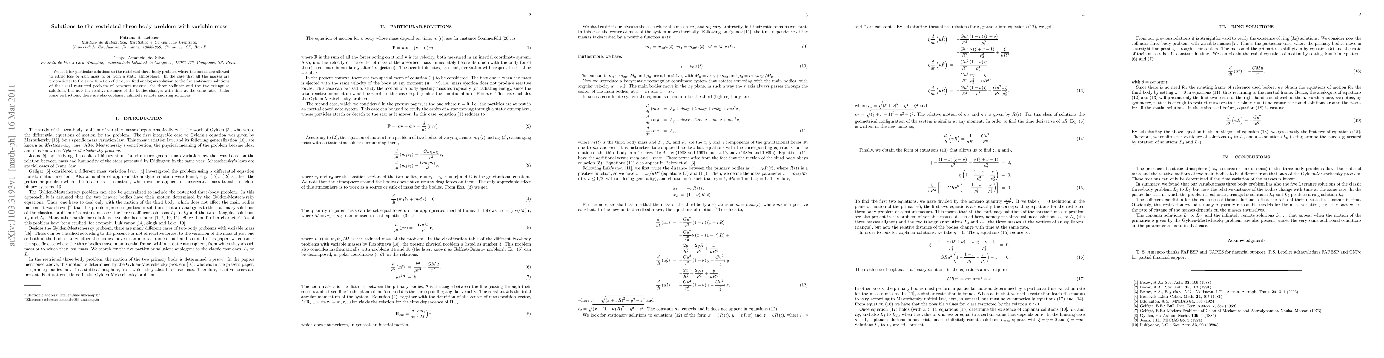 We look for particular solutions to the restricted three-body problem where the bodies are allowed to either lose or gain mass to or from a static atmosphere. In the case that all the masses are proportional to the same function of time,we find analogous solution to the five stationary solutions of the usual restricted problem of constant masses: the three collinear and the two triangular solutions, but now the relative distance of the bodies changes with time at the same rate. Under some restrictions, there are also coplanar, infinitely remote and ring solutions.